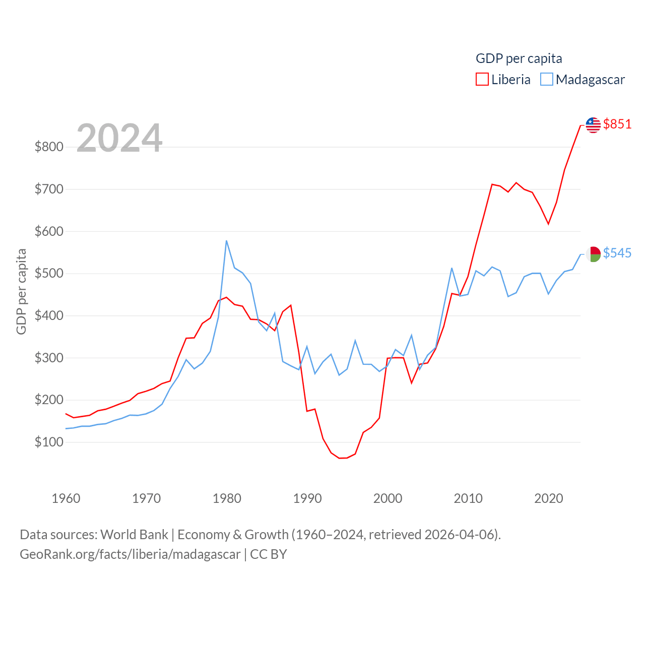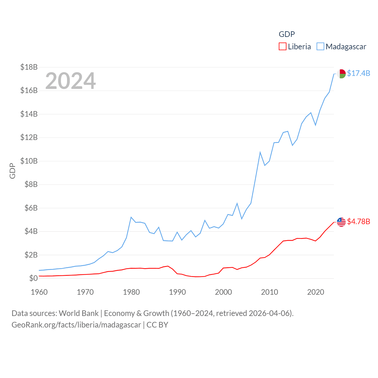 By GDP, Liberia ranks 163/197 ($4.78B) and Madagascar ranks 136/197 ($17.4B). By GDP per capita, Liberia ranks 184/197 ($851), while Madagascar ranks 193/197 ($545).