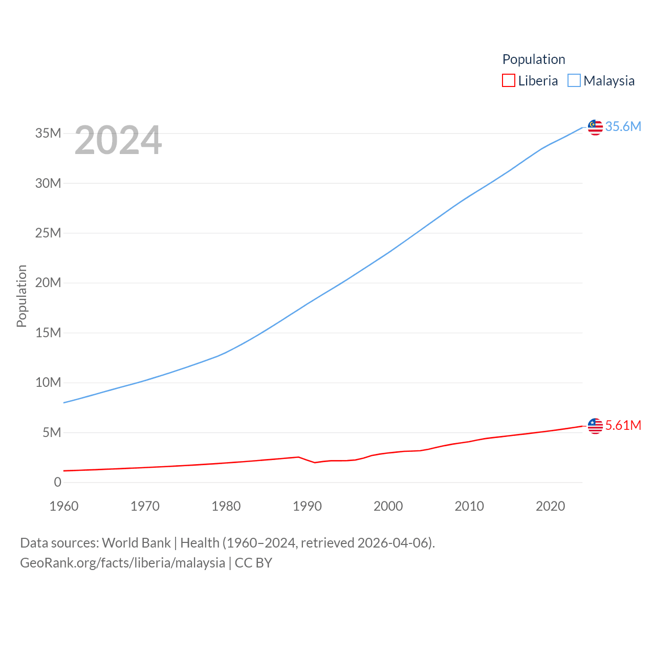 Liberia has a population of 5.61M (ranked 117/197), compared with 35.6M in Malaysia (ranked 44/197). Liberia's land area is 37,189 sq mi versus 126,854 sq mi for Malaysia (ranked 106th vs. 65th).