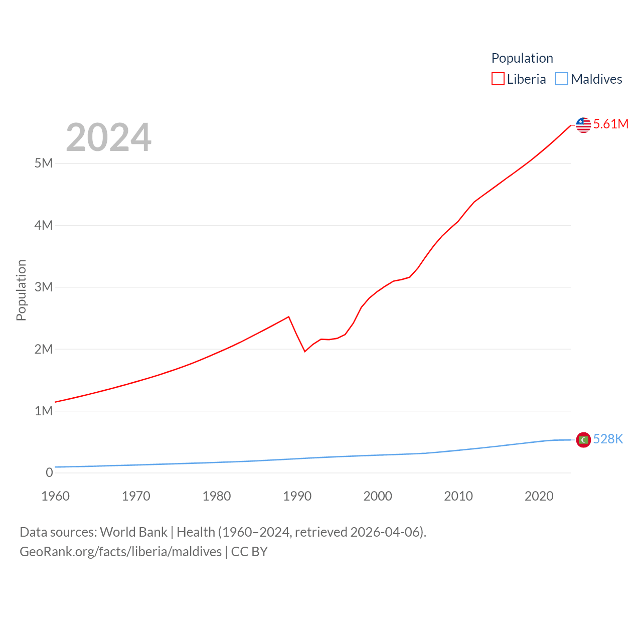Liberia has a population of 5.61M (ranked 117/197), compared with 528K in Maldives (ranked 168/197). Liberia's land area is 37,189 sq mi versus 115.1 sq mi for Maldives (ranked 106th vs. 188th).