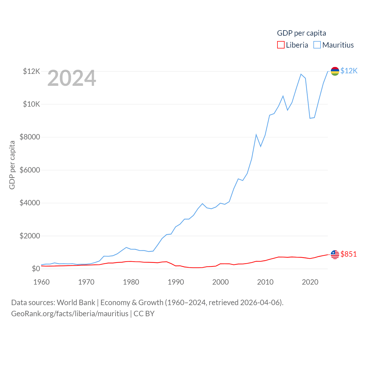By GDP, Liberia ranks 163/197 ($4.78B) and Mauritius ranks 143/197 ($14.9B). By GDP per capita, Liberia ranks 184/197 ($851), while Mauritius ranks 78/197 ($11,991).