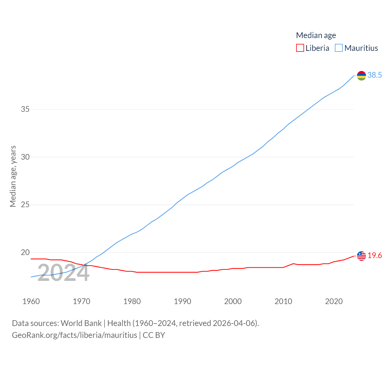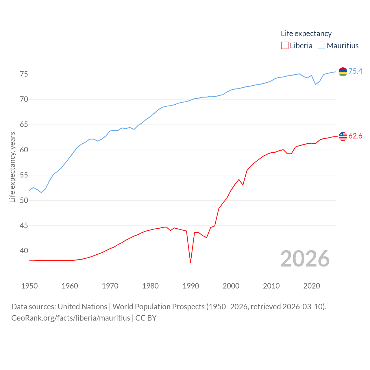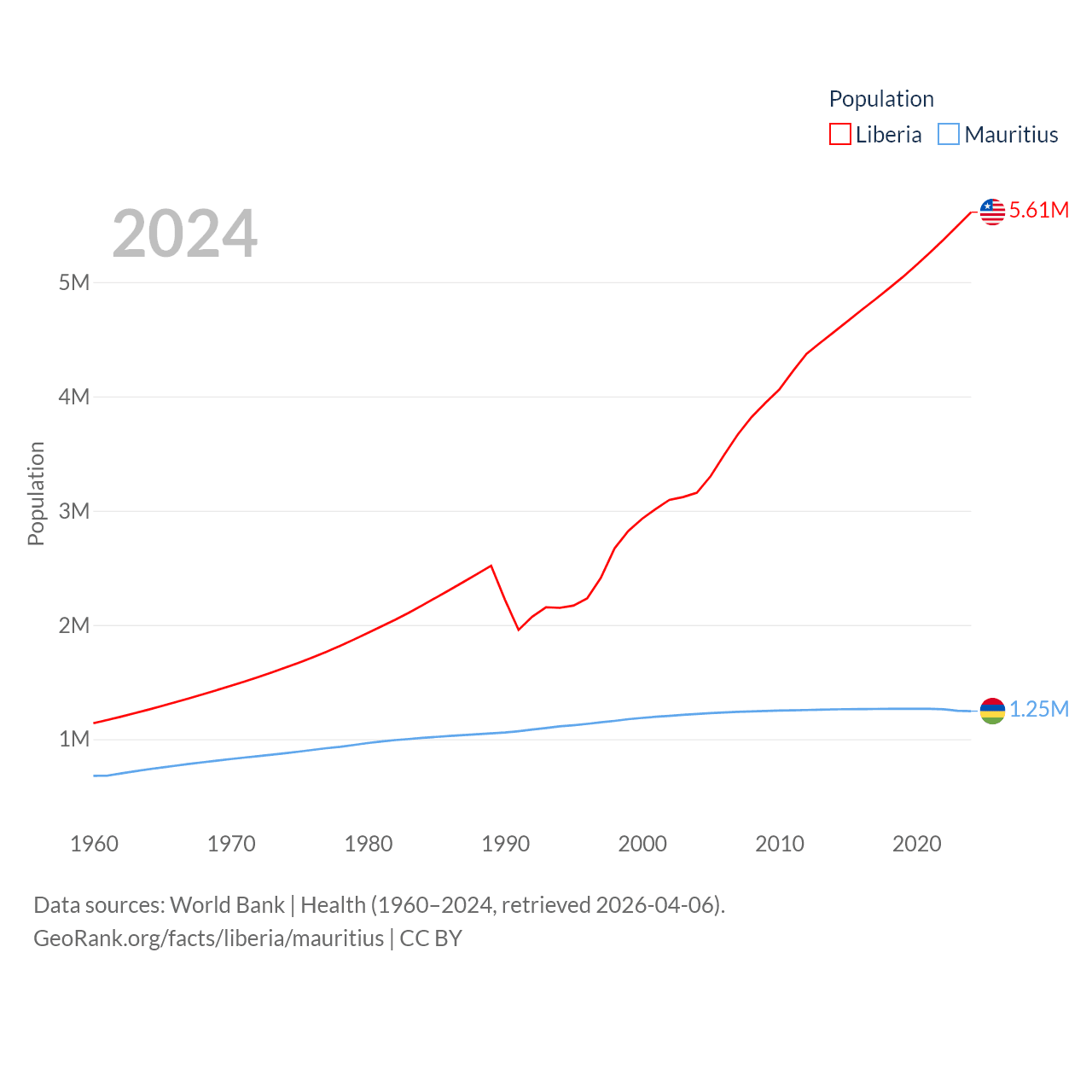 Liberia has a population of 5.61M (ranked 117/197), compared with 1.25M in Mauritius (ranked 156/197). Liberia's land area is 37,189 sq mi versus 771 sq mi for Mauritius (ranked 106th vs. 170th).
