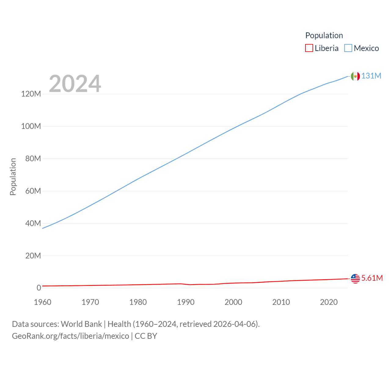 Liberia has a population of 5.61M (ranked 117/197), compared with 131M in Mexico (ranked 11/197). Liberia's land area is 37,189 sq mi versus 750,563 sq mi for Mexico (ranked 106th vs. 13th).