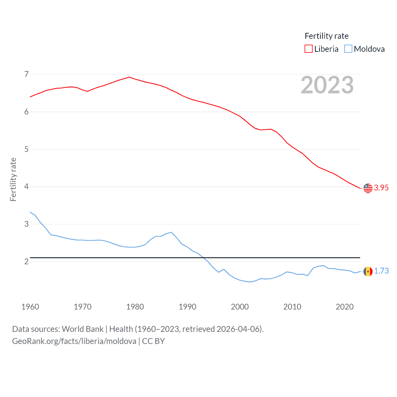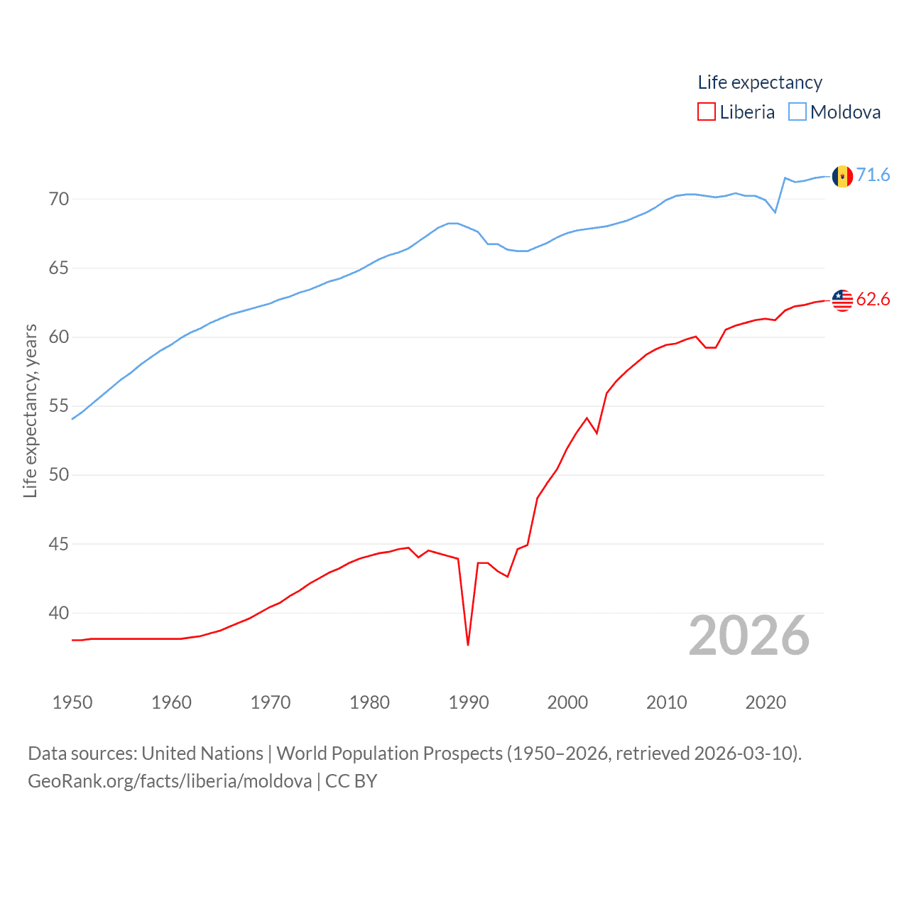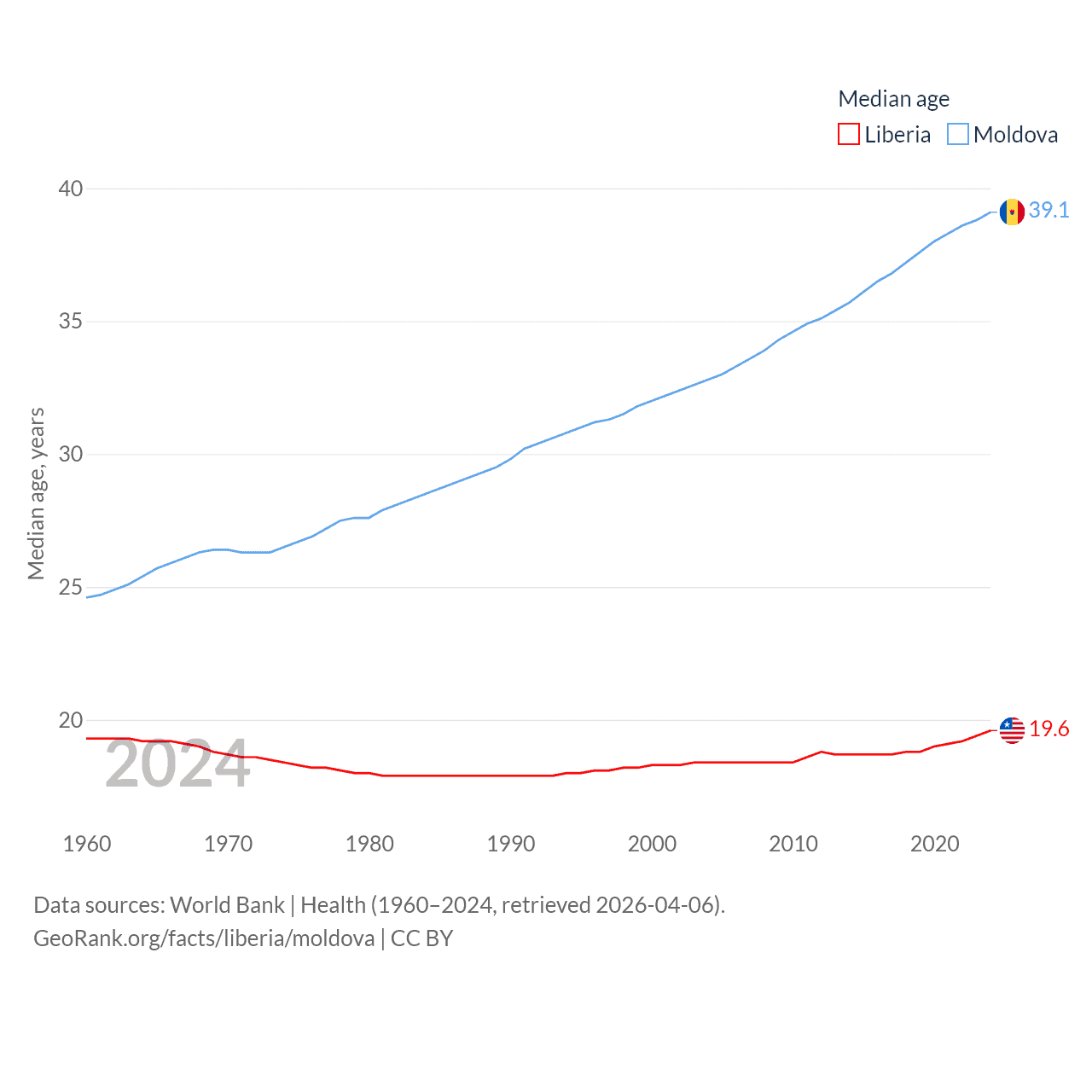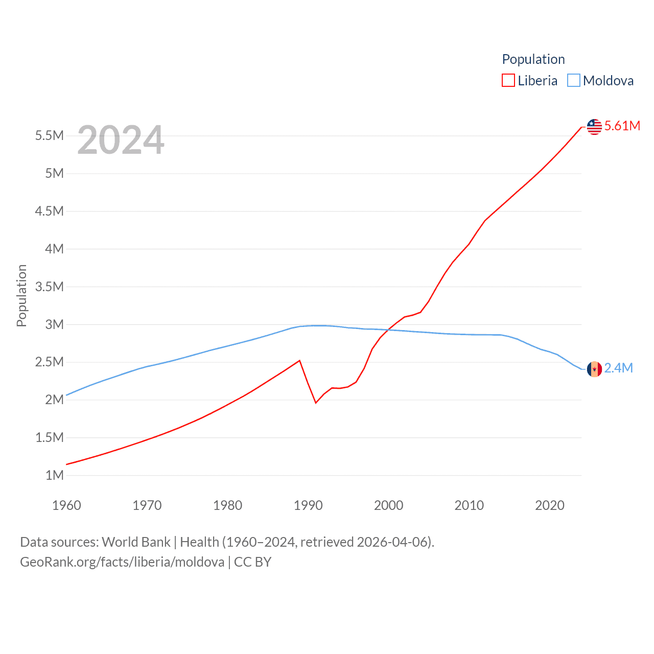 Liberia has a population of 5.61M (ranked 117/197), compared with 2.4M in Moldova (ranked 143/197). Liberia's land area is 37,189 sq mi versus 12,714 sq mi for Moldova (ranked 106th vs. 135th).
