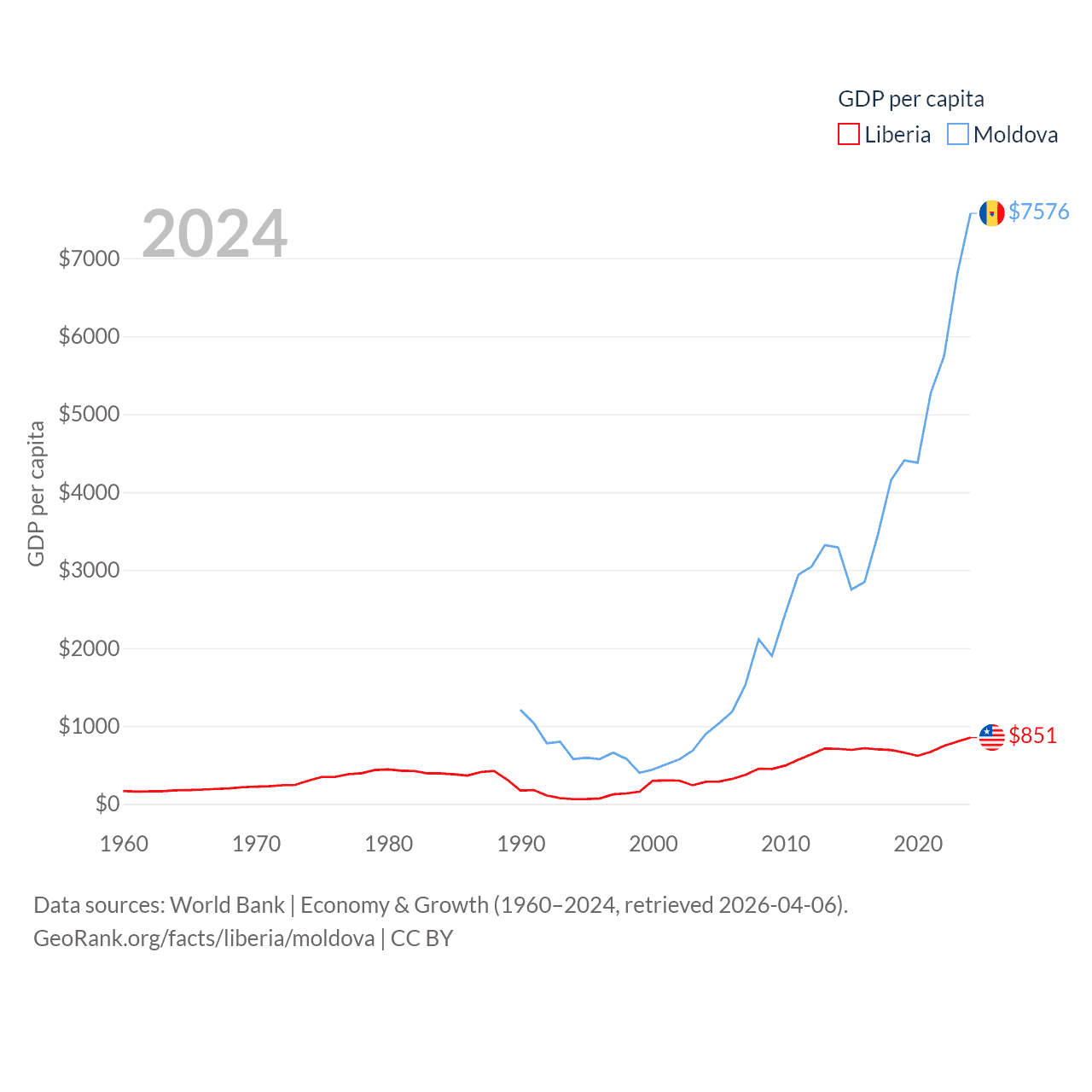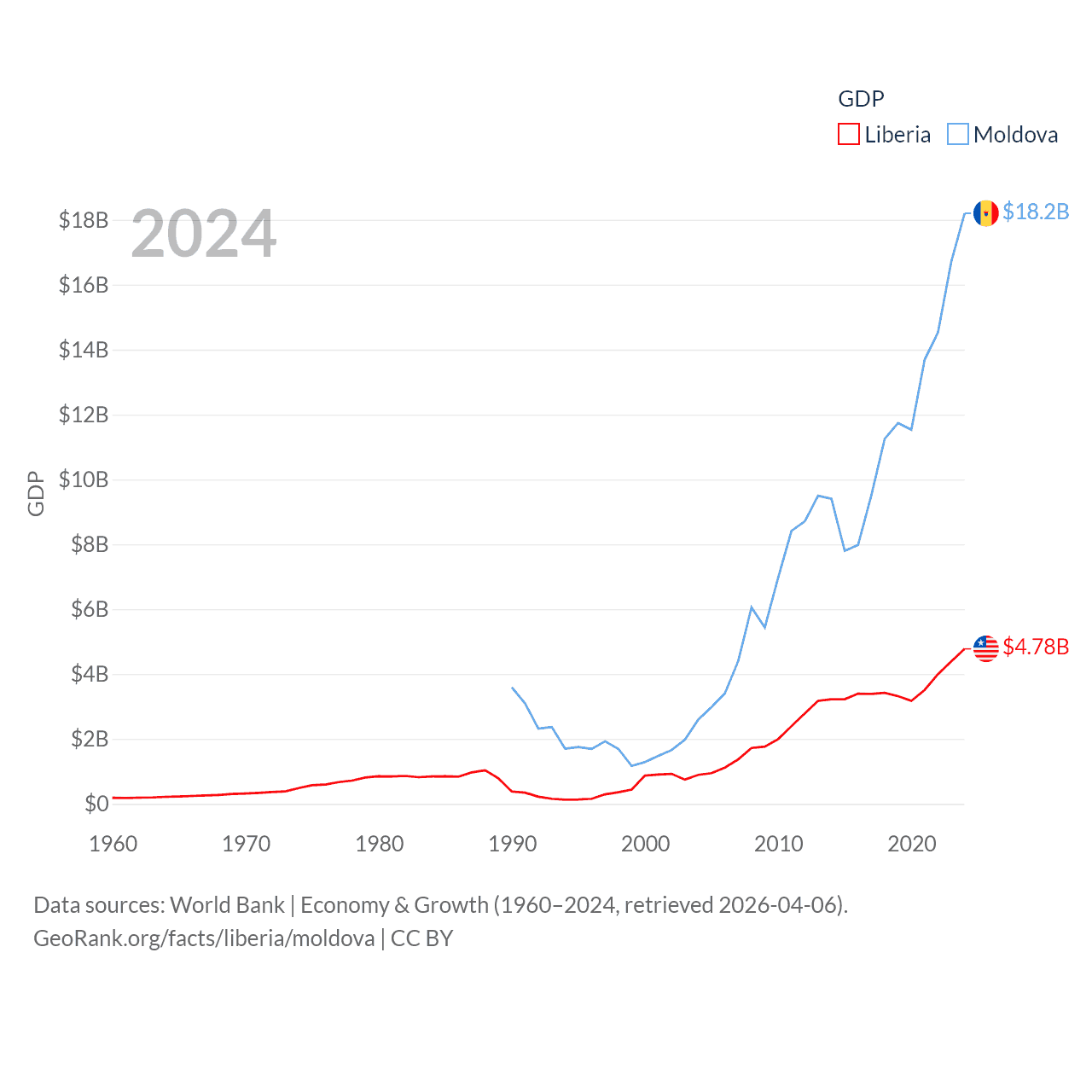 By GDP, Liberia ranks 163/197 ($4.78B) and Moldova ranks 134/197 ($18.2B). By GDP per capita, Liberia ranks 184/197 ($851), while Moldova ranks 99/197 ($7,576).