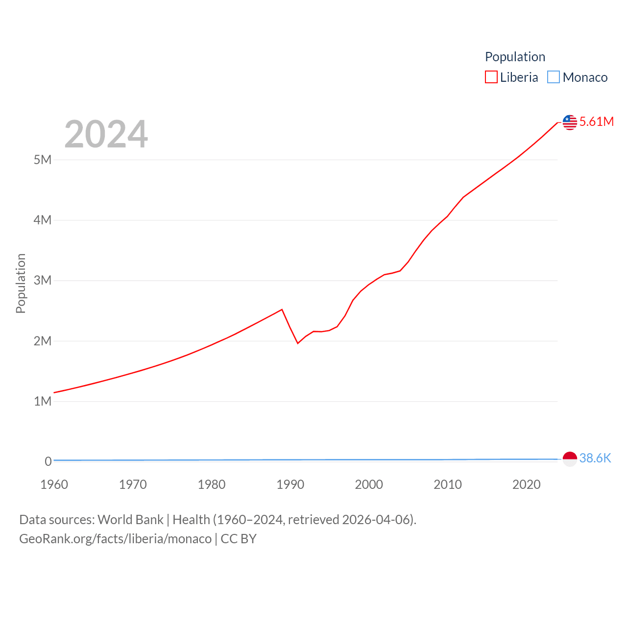 Liberia has a population of 5.61M (ranked 117/197), compared with 38.6K in Monaco (ranked 191/197). Liberia's land area is 37,189 sq mi versus 0.8 sq mi for Monaco (ranked 106th vs. 196th).