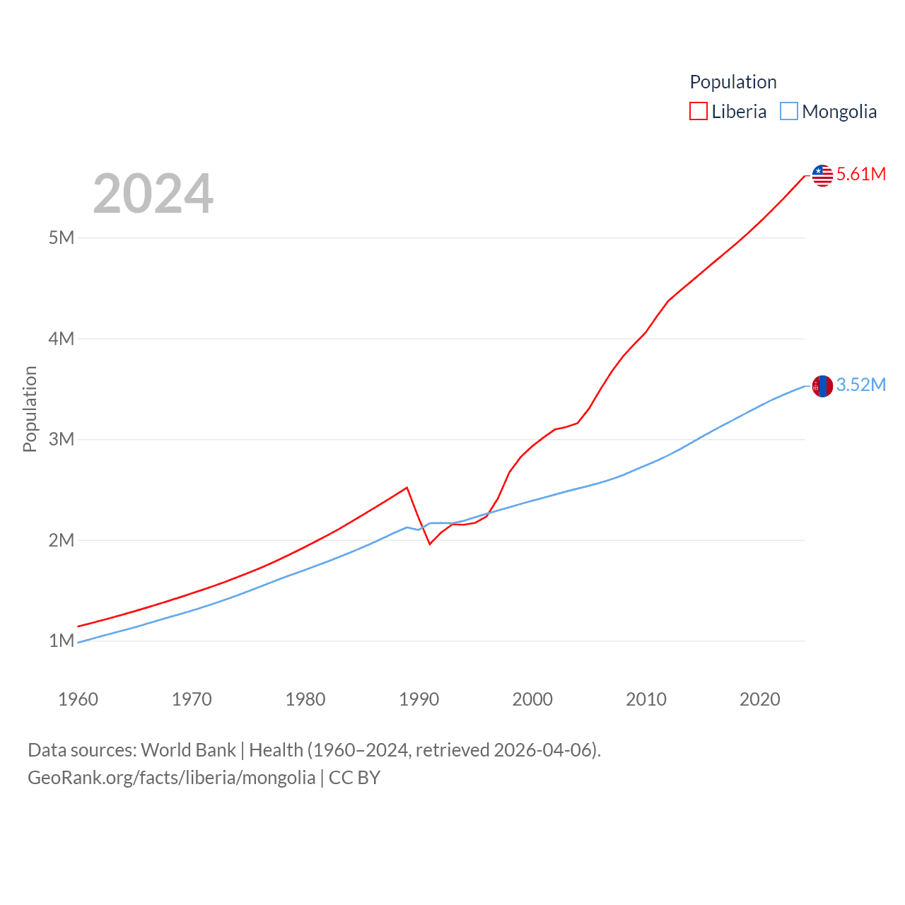 Liberia has a population of 5.61M (ranked 117/197), compared with 3.52M in Mongolia (ranked 132/197). Liberia's land area is 37,189 sq mi versus 601,740 sq mi for Mongolia (ranked 106th vs. 18th).