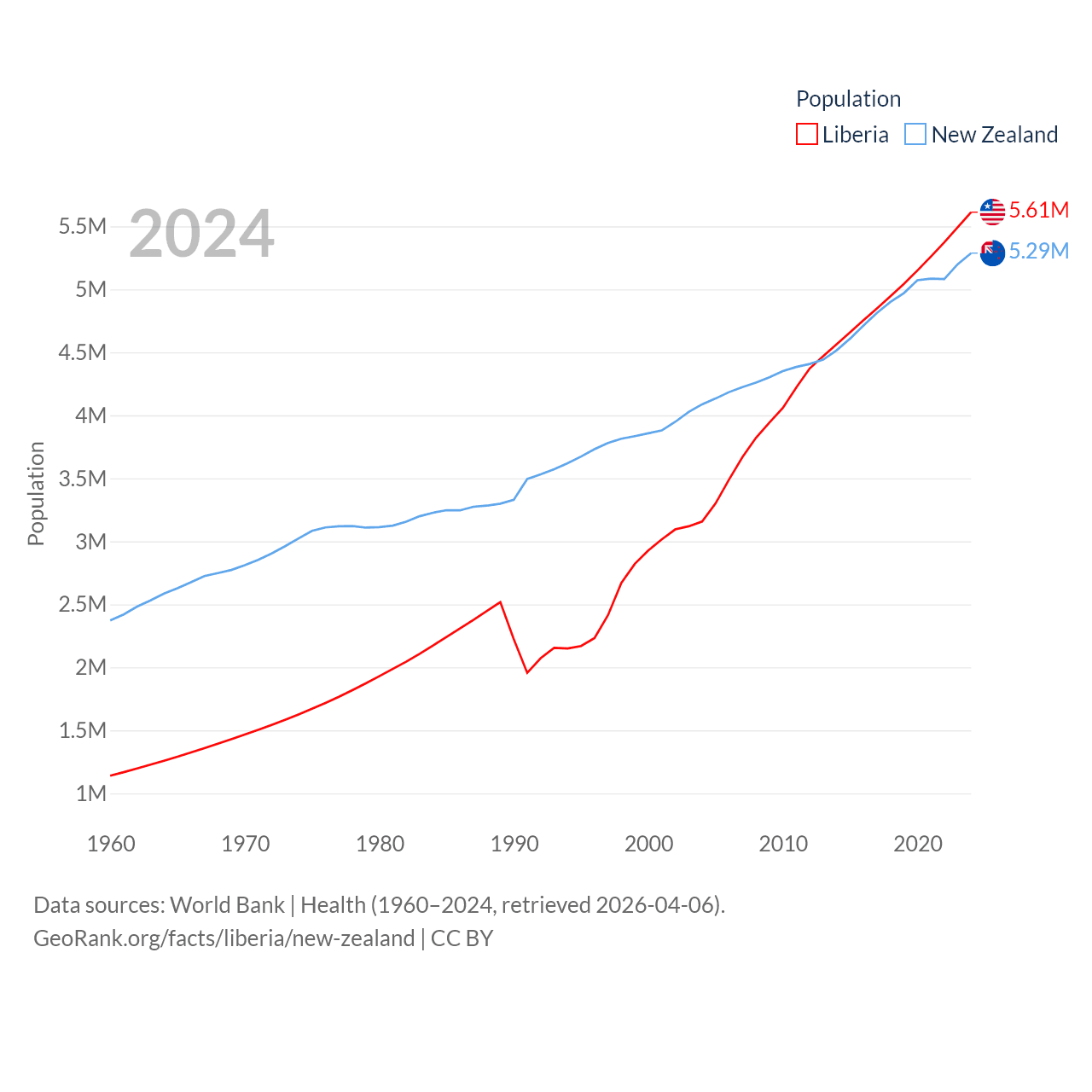 Liberia has a population of 5.61M (ranked 117/197), compared with 5.29M in New Zealand (ranked 123/197). Liberia's land area is 37,189 sq mi versus 101,665 sq mi for New Zealand (ranked 106th vs. 74th).