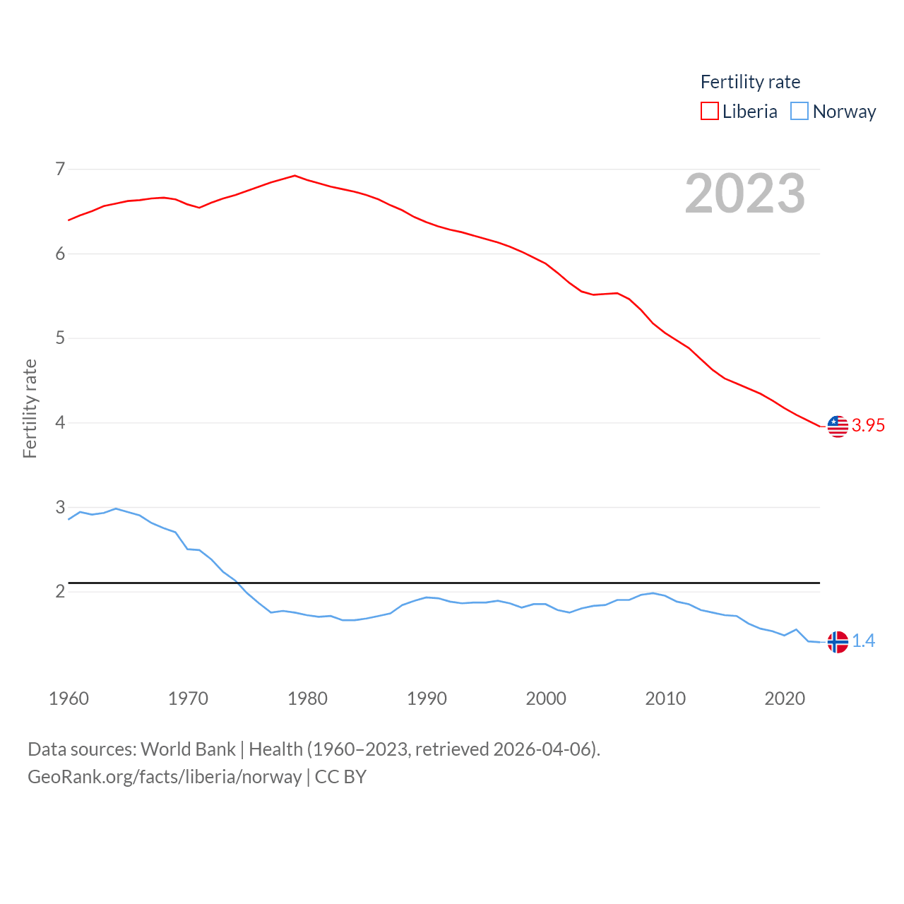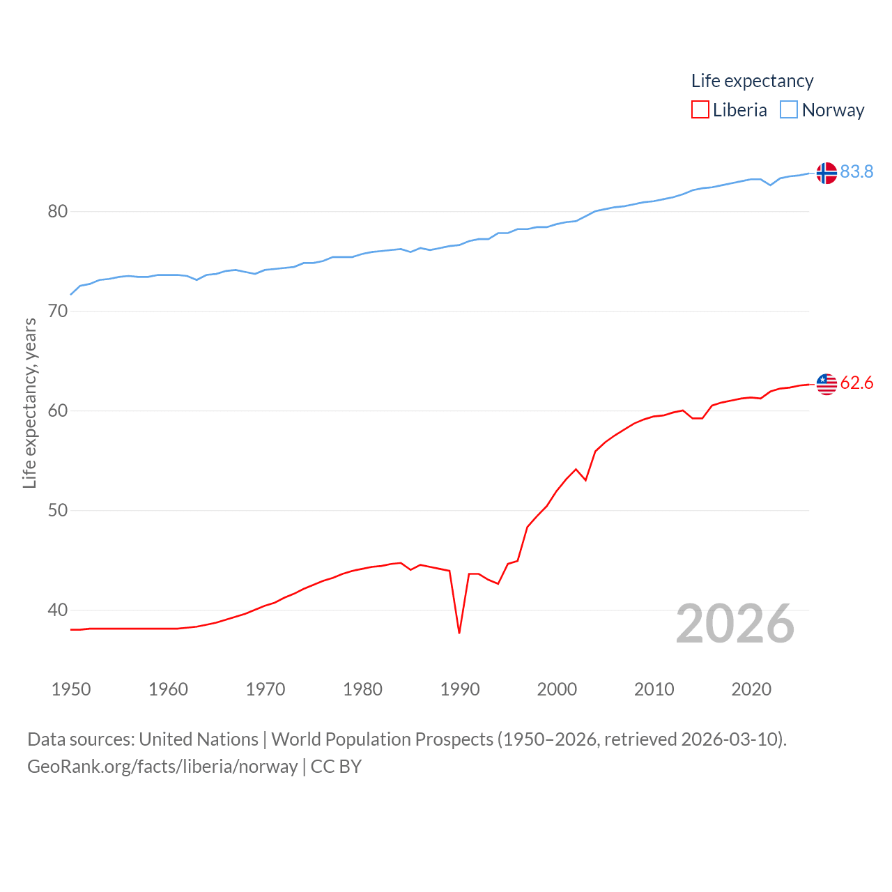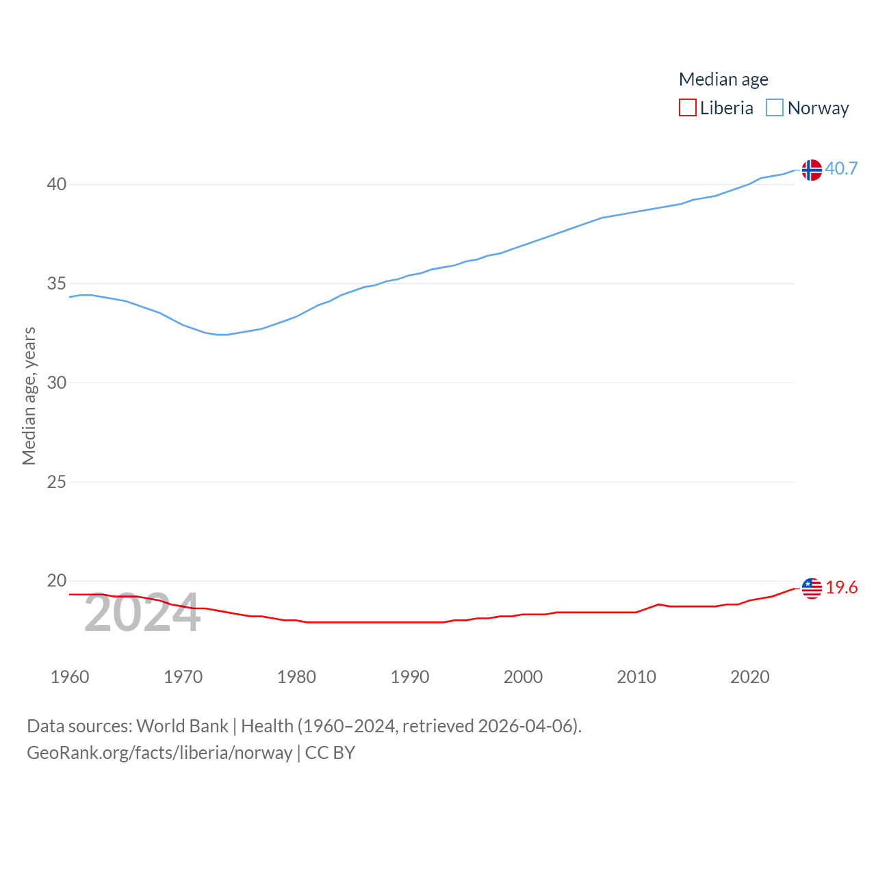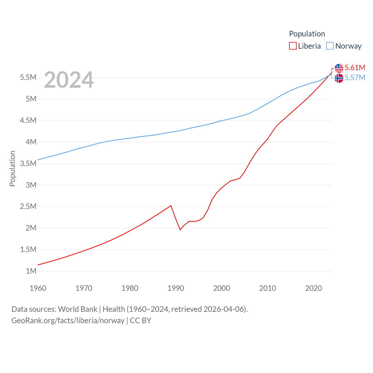 Liberia has a population of 5.61M (ranked 117/197), compared with 5.57M in Norway (ranked 118/197). Liberia's land area is 37,189 sq mi versus 140,645 sq mi for Norway (ranked 106th vs. 62nd).