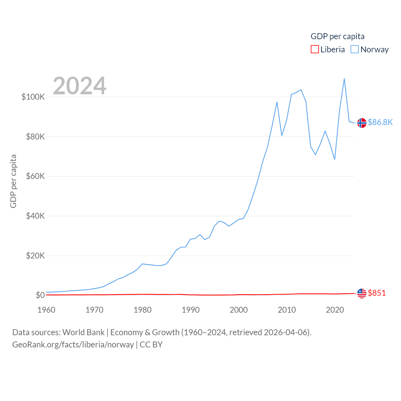 By GDP, Liberia ranks 163/197 ($4.78B) and Norway ranks 32/197 ($484B). By GDP per capita, Liberia ranks 184/197 ($851), while Norway ranks 8/197 ($86,785).