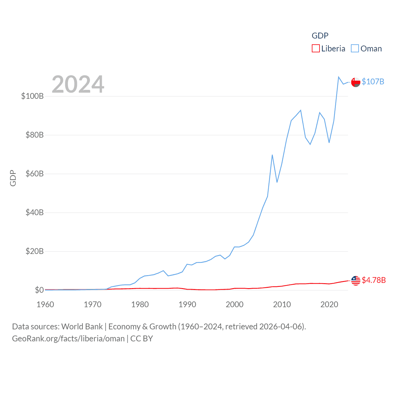 By GDP, Liberia ranks 163/197 ($4.78B) and Oman ranks 70/197 ($107B). By GDP per capita, Liberia ranks 184/197 ($851), while Oman ranks 57/197 ($20,285).