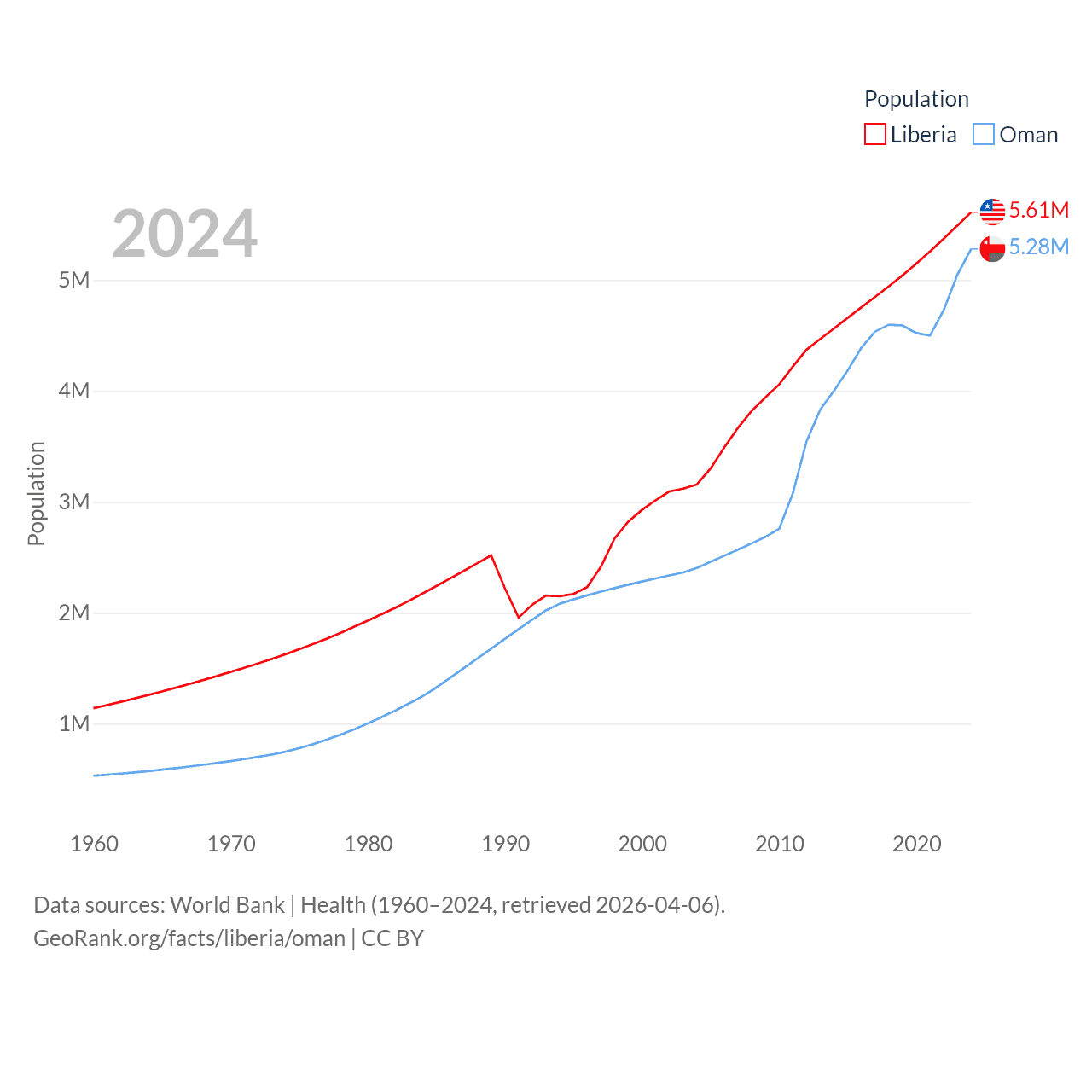 Liberia has a population of 5.61M (ranked 117/197), compared with 5.28M in Oman (ranked 124/197). Liberia's land area is 37,189 sq mi versus 119,499 sq mi for Oman (ranked 106th vs. 68th).