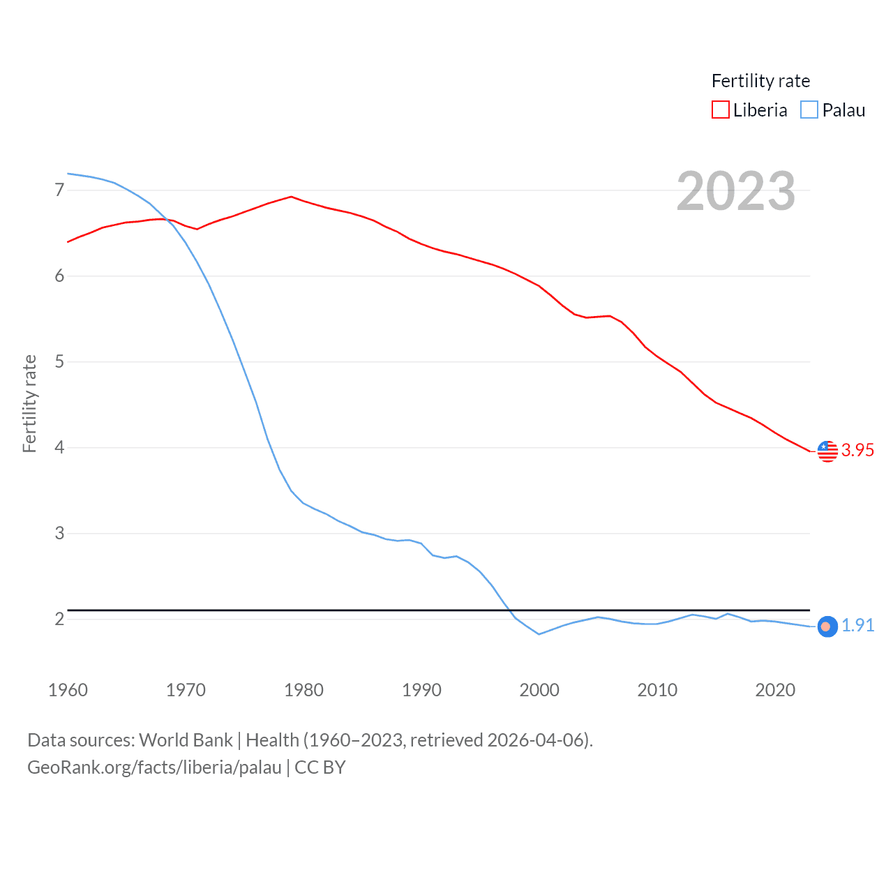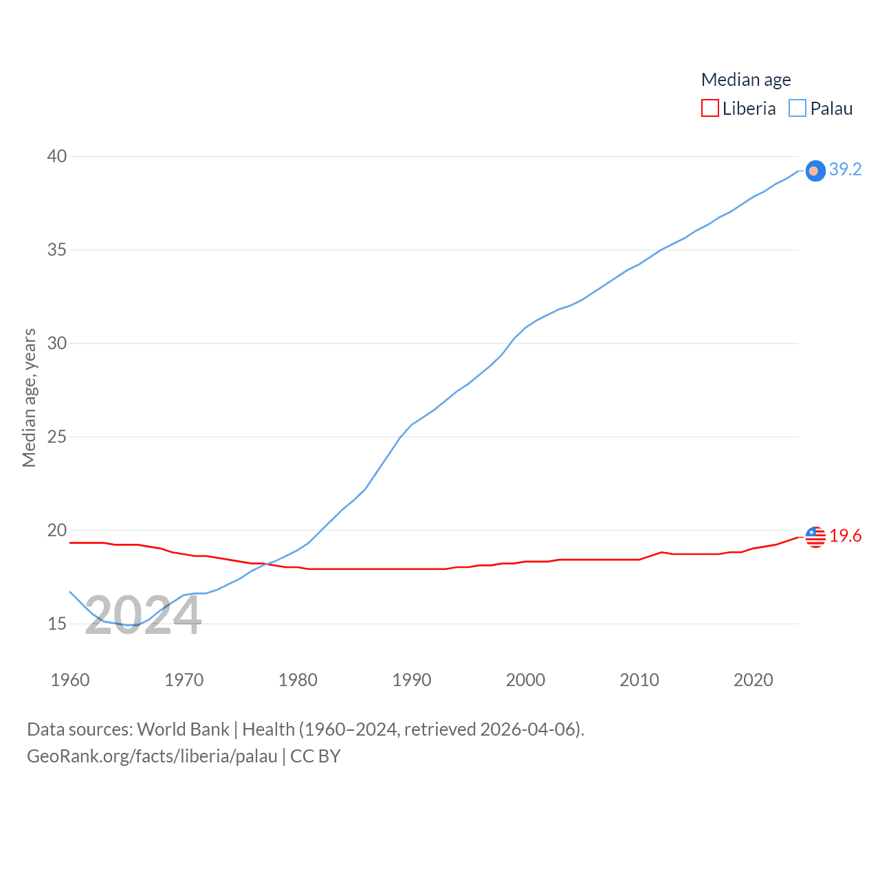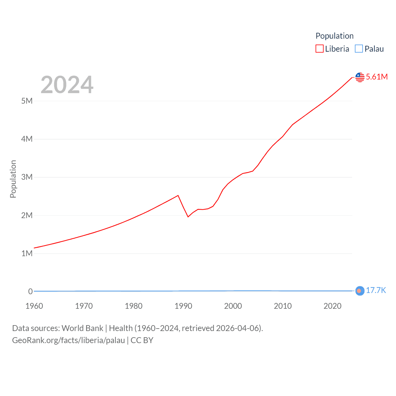 Liberia has a population of 5.61M (ranked 117/197), compared with 17.7K in Palau (ranked 194/197). Liberia's land area is 37,189 sq mi versus 177.6 sq mi for Palau (ranked 106th vs. 180th).