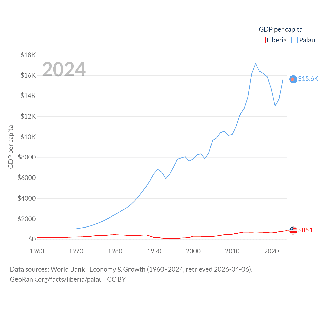 By GDP, Liberia ranks 163/197 ($4.78B) and Palau ranks 194/197 ($277M). By GDP per capita, Liberia ranks 184/197 ($851), while Palau ranks 67/197 ($15,611).