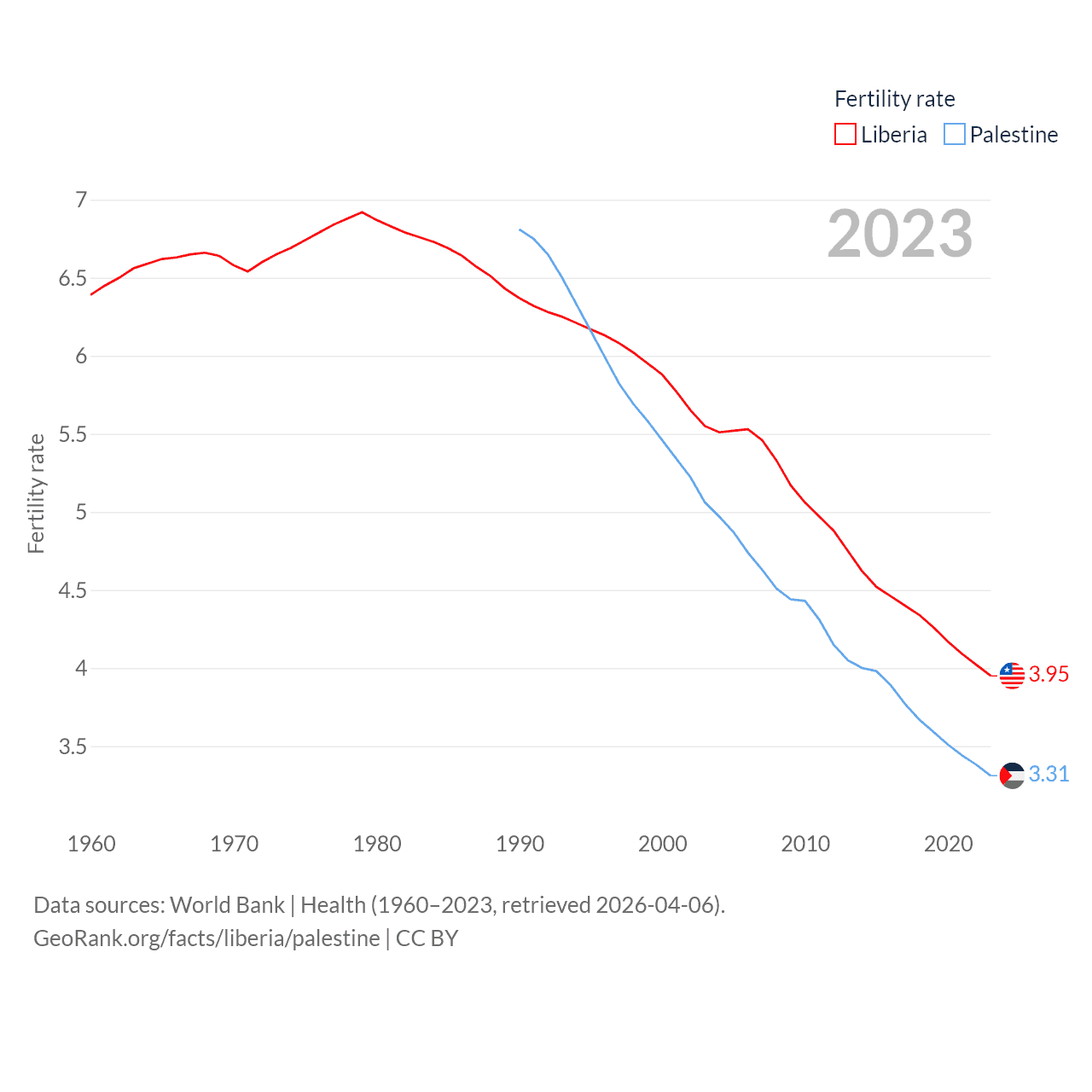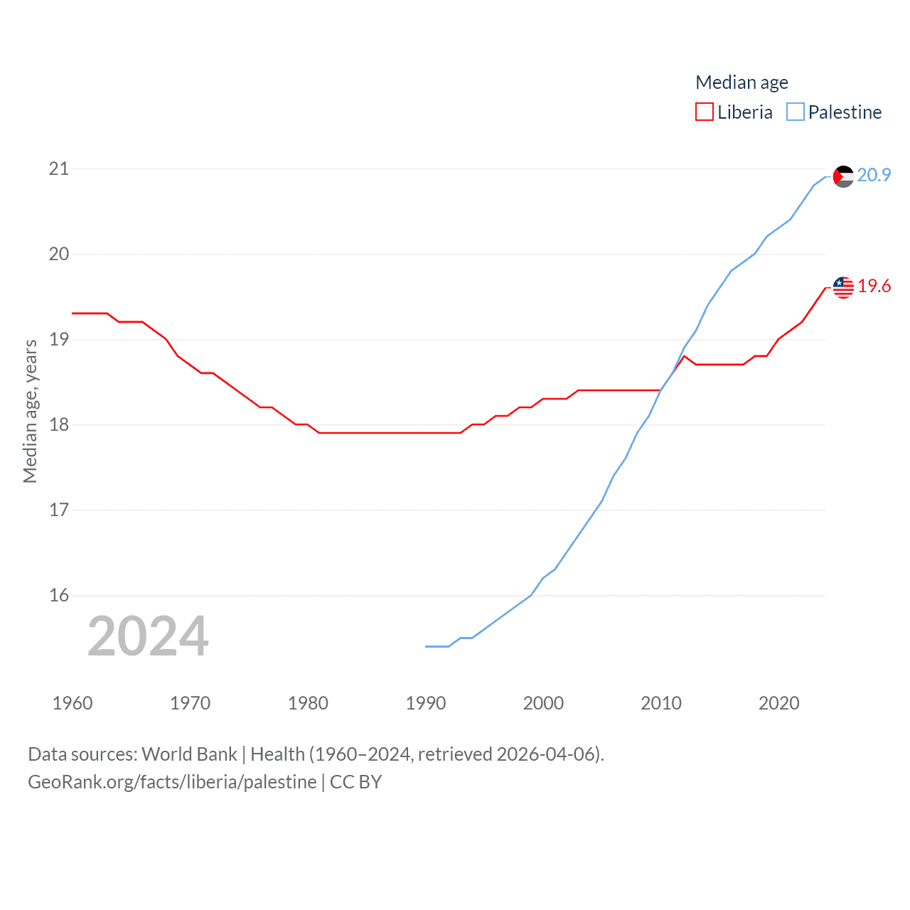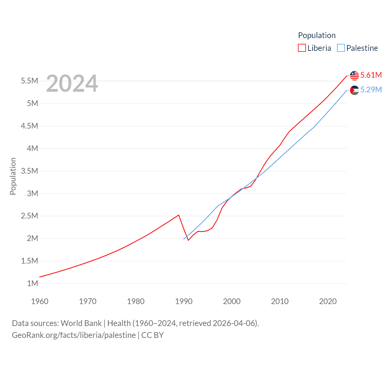 Liberia has a population of 5.61M (ranked 117/197), compared with 5.29M in Palestine (ranked 122/197). Liberia's land area is 37,189 sq mi versus 2,326 sq mi for Palestine (ranked 106th vs. 164th).