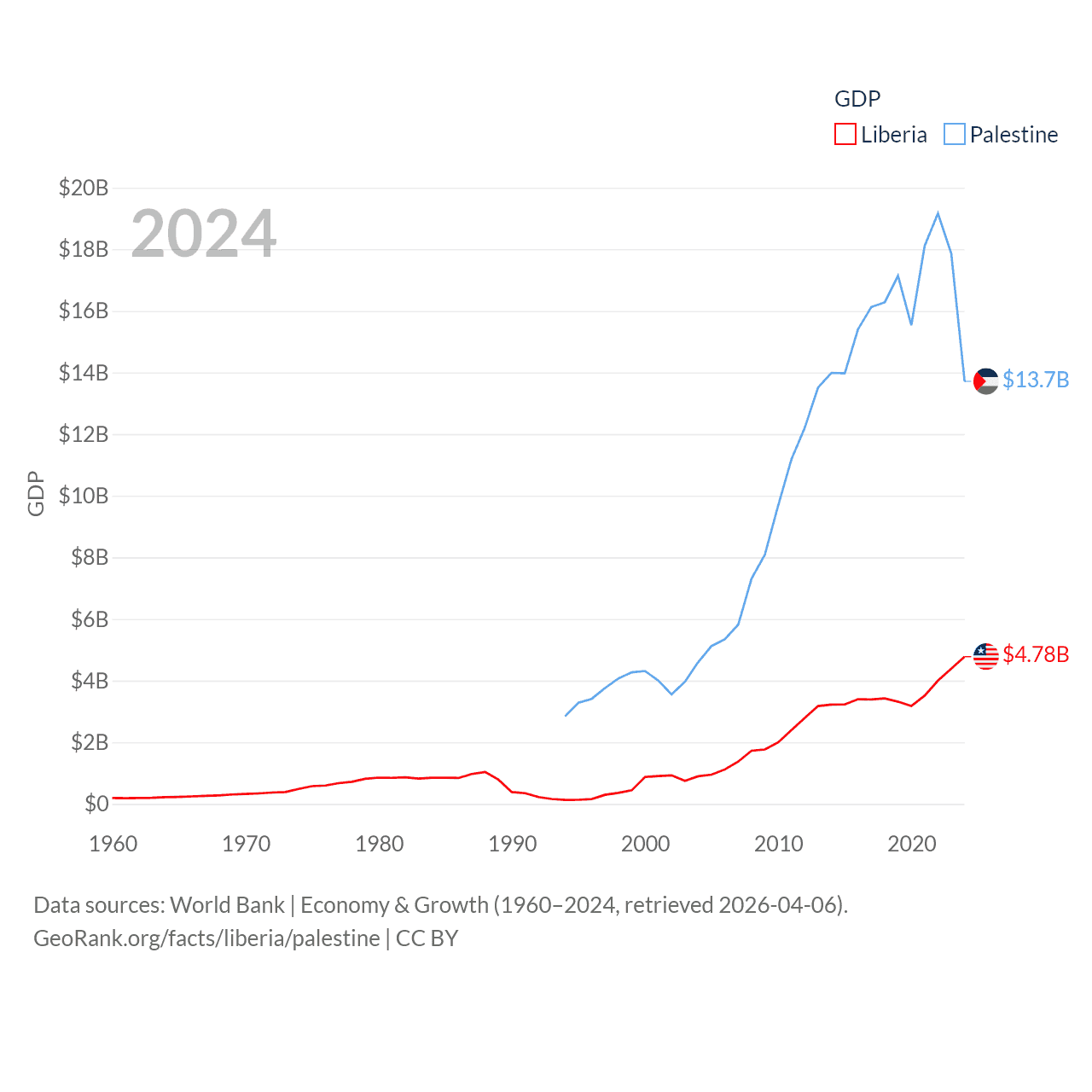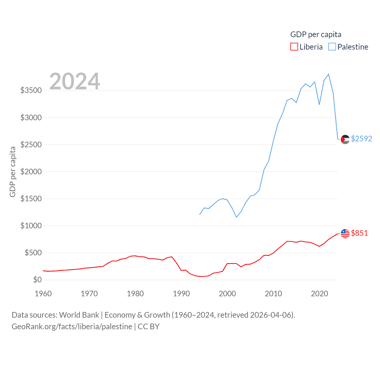 By GDP, Liberia ranks 163/197 ($4.78B) and Palestine ranks 146/197 ($13.7B). By GDP per capita, Liberia ranks 184/197 ($851), while Palestine ranks 147/197 ($2,592).
