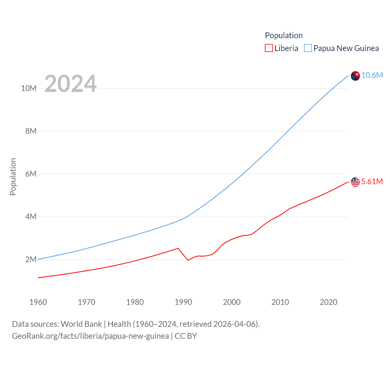 Liberia has a population of 5.61M (ranked 117/197), compared with 10.6M in Papua New Guinea (ranked 92/197). Liberia's land area is 37,189 sq mi versus 174,850 sq mi for Papua New Guinea (ranked 106th vs. 54th).