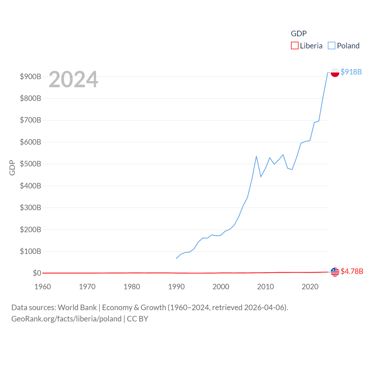 By GDP, Liberia ranks 163/197 ($4.78B) and Poland ranks 21/197 ($918B). By GDP per capita, Liberia ranks 184/197 ($851), while Poland ranks 48/197 ($25,104).