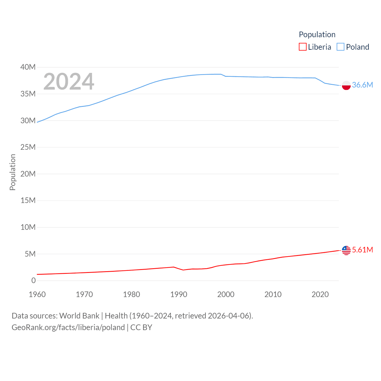 Liberia has a population of 5.61M (ranked 117/197), compared with 36.6M in Poland (ranked 42/197). Liberia's land area is 37,189 sq mi versus 118,252 sq mi for Poland (ranked 106th vs. 69th).