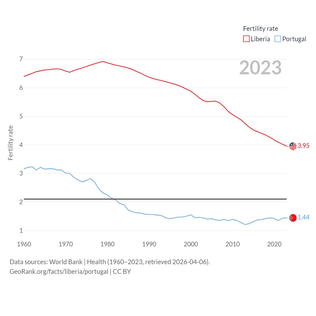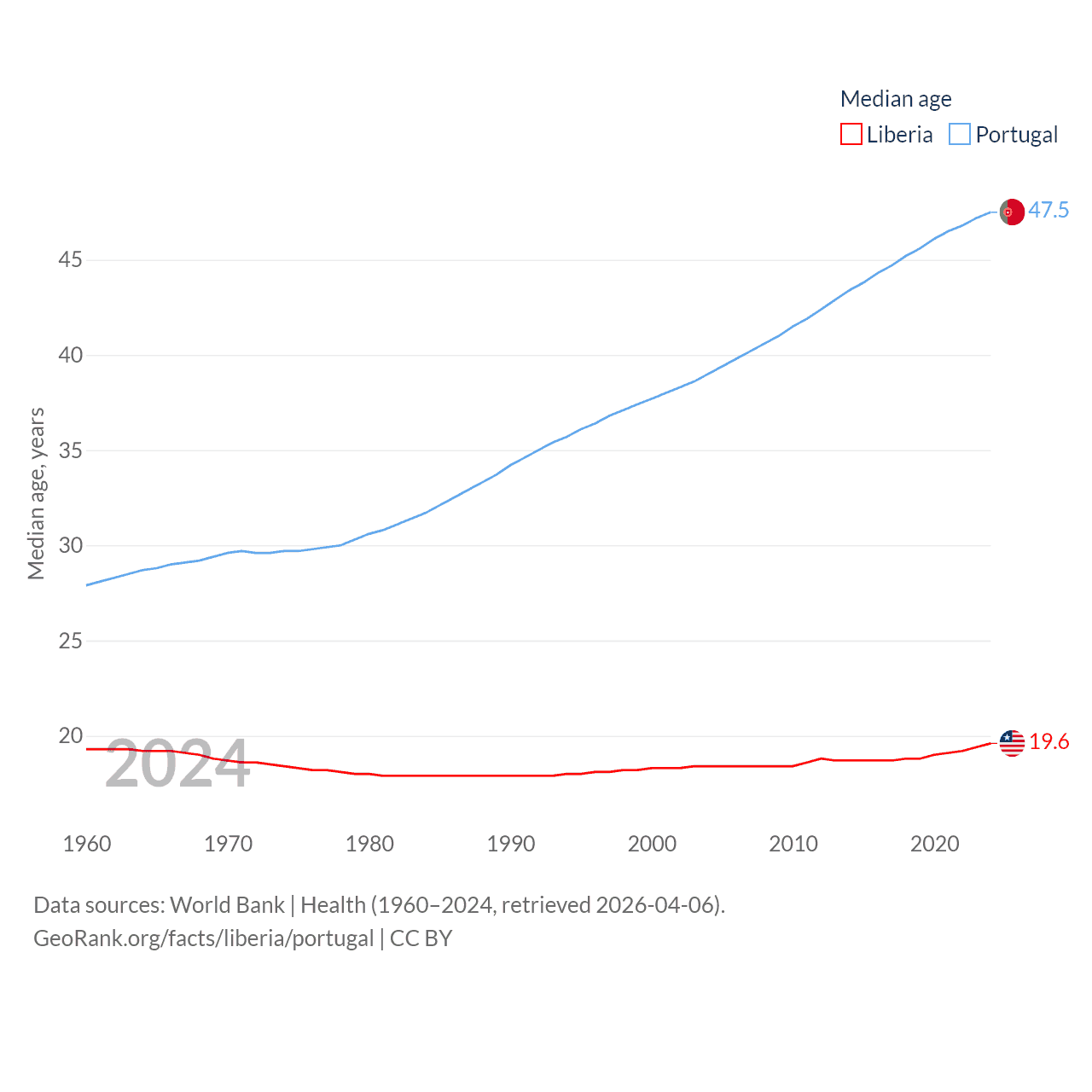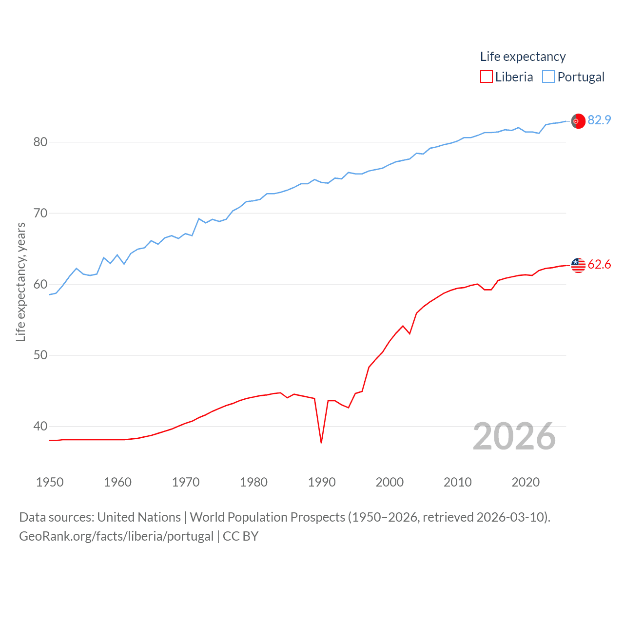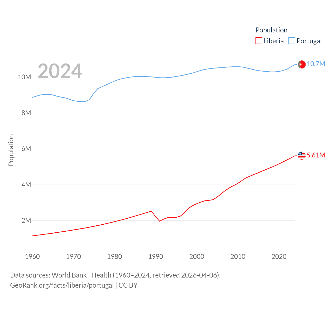 Liberia has a population of 5.61M (ranked 117/197), compared with 10.7M in Portugal (ranked 90/197). Liberia's land area is 37,189 sq mi versus 35,369 sq mi for Portugal (ranked 106th vs. 108th).