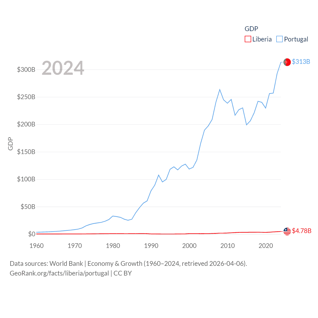 By GDP, Liberia ranks 163/197 ($4.78B) and Portugal ranks 46/197 ($313B). By GDP per capita, Liberia ranks 184/197 ($851), while Portugal ranks 44/197 ($29,292).