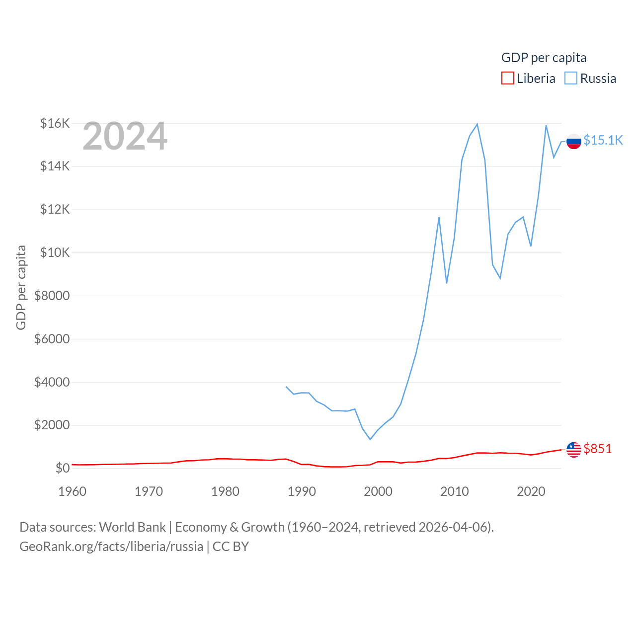 By GDP, Liberia ranks 163/197 ($4.78B) and Russia ranks 11/197 ($2.17T). By GDP per capita, Liberia ranks 184/197 ($851), while Russia ranks 68/197 ($15,145).