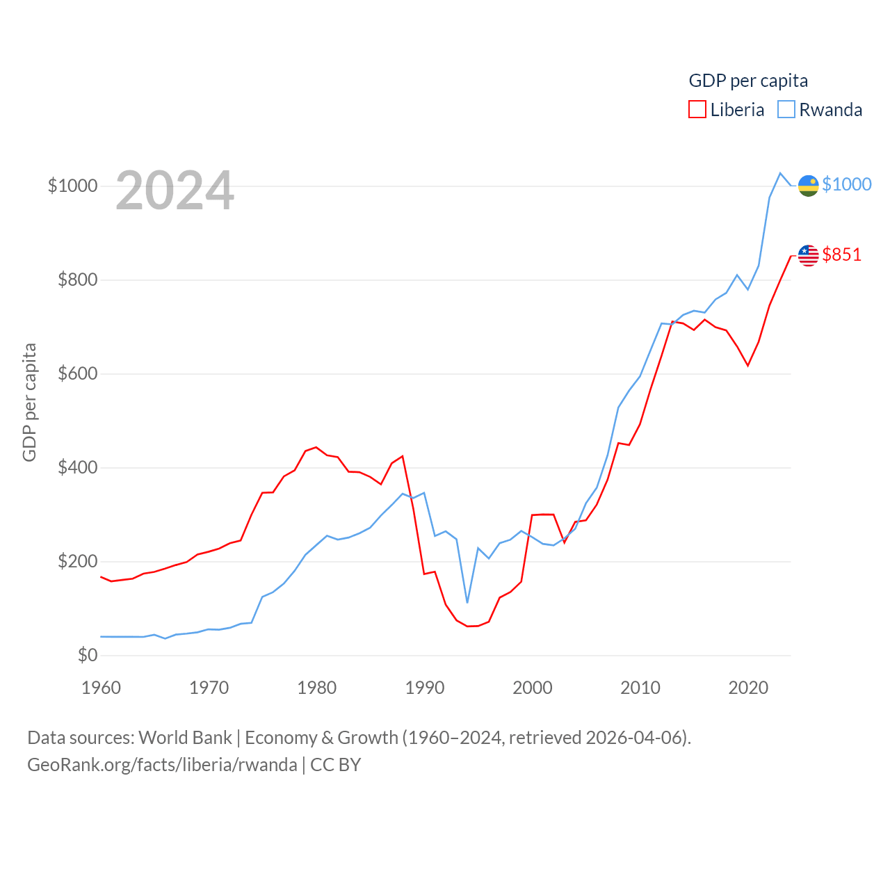 By GDP, Liberia ranks 163/197 ($4.78B) and Rwanda ranks 144/197 ($14.3B). By GDP per capita, Liberia ranks 184/197 ($851), while Rwanda ranks 178/197 ($1,000).