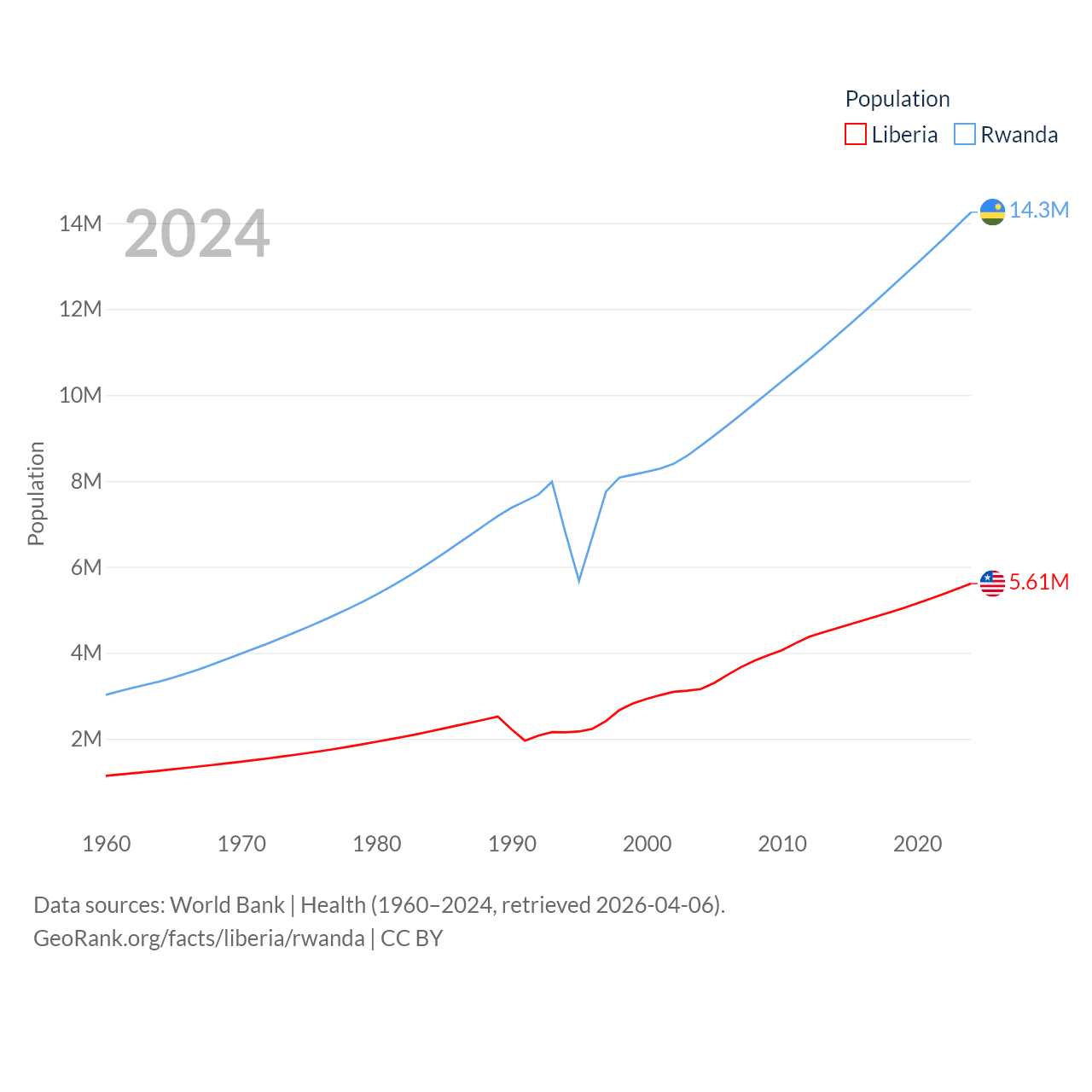 Liberia has a population of 5.61M (ranked 117/197), compared with 14.3M in Rwanda (ranked 77/197). Liberia's land area is 37,189 sq mi versus 9,525 sq mi for Rwanda (ranked 106th vs. 146th).