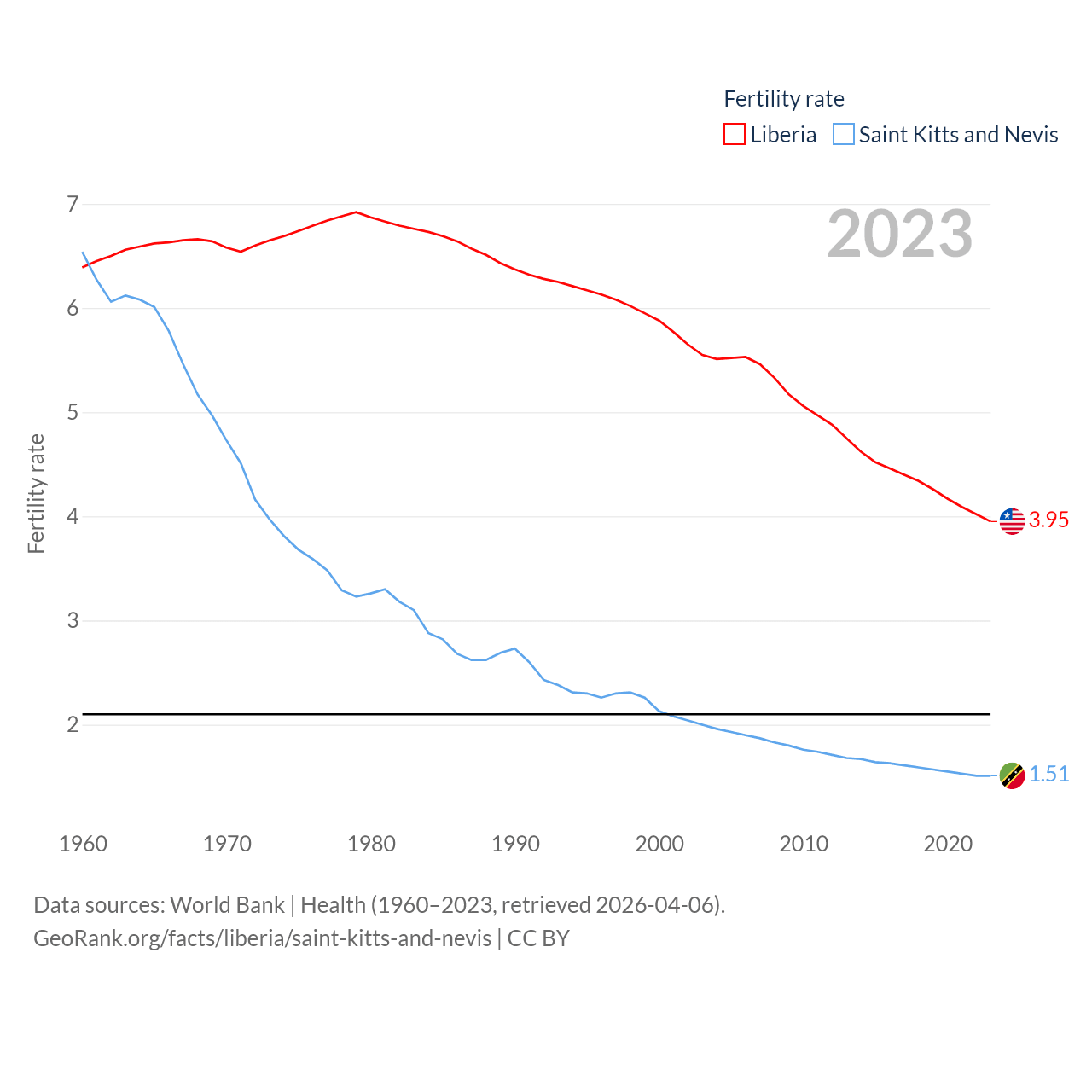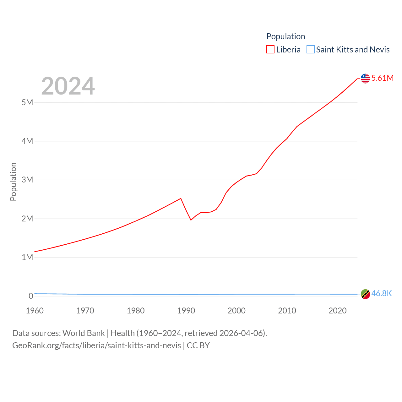Liberia has a population of 5.61M (ranked 117/197), compared with 46.8K in Saint Kitts and Nevis (ranked 189/197). Liberia's land area is 37,189 sq mi versus 100.4 sq mi for Saint Kitts and Nevis (ranked 106th vs. 189th).