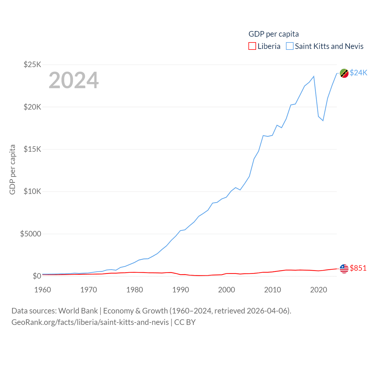 By GDP, Liberia ranks 163/197 ($4.78B) and Saint Kitts and Nevis ranks 187/197 ($1.12B). By GDP per capita, Liberia ranks 184/197 ($851), while Saint Kitts and Nevis ranks 51/197 ($23,961).