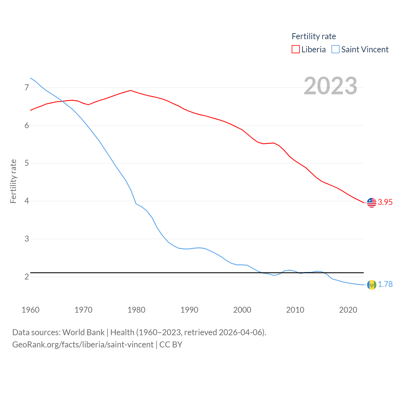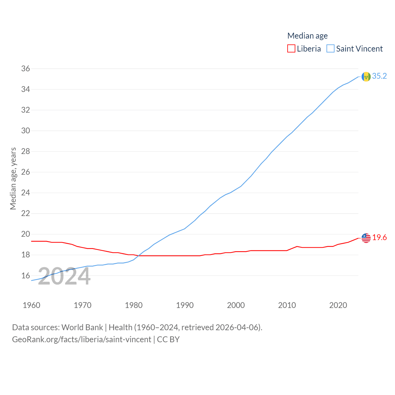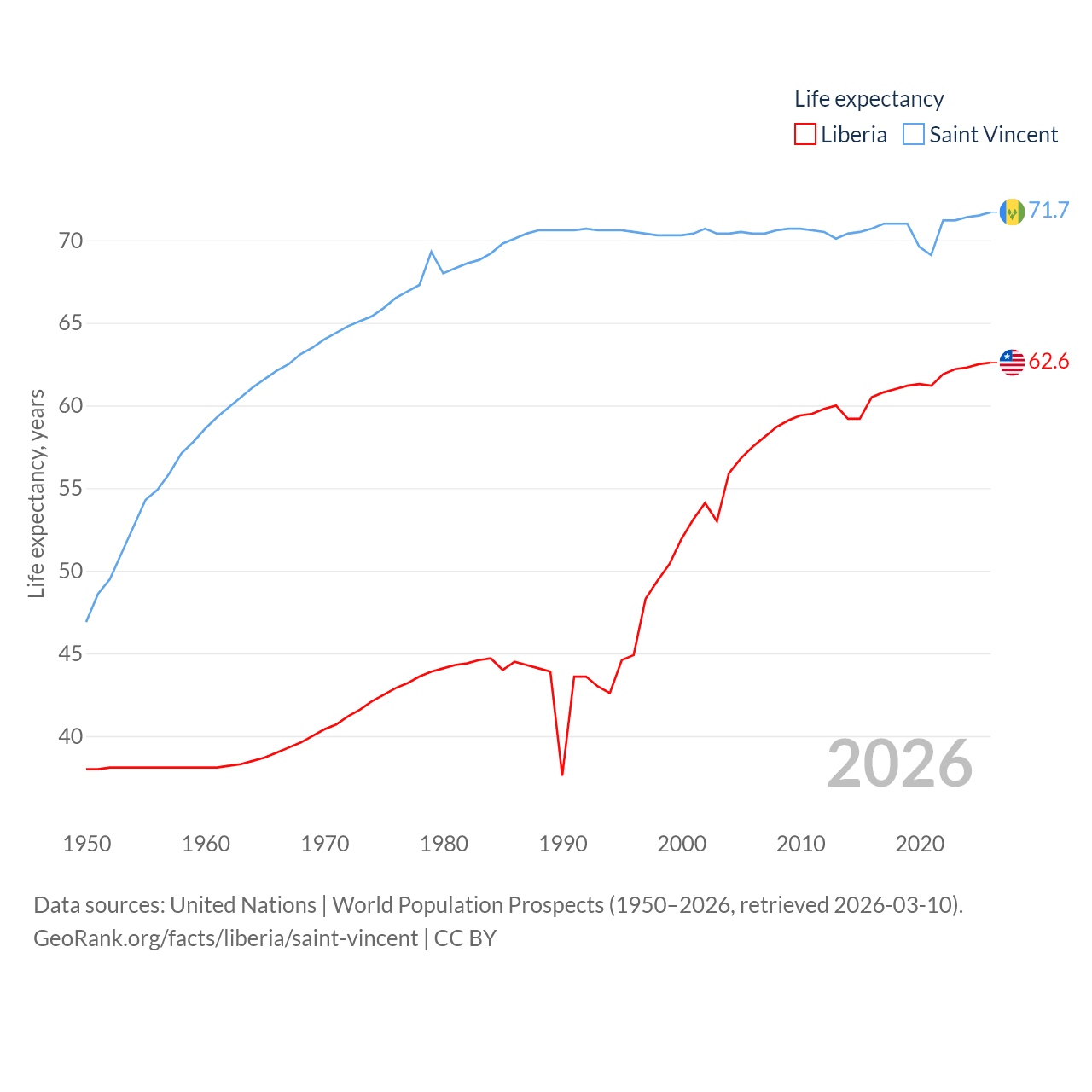 Liberia has a population of 5.61M (ranked 117/197), compared with 101K in Saint Vincent (ranked 184/197). Liberia's land area is 37,189 sq mi versus 150.6 sq mi for Saint Vincent (ranked 106th vs. 185th).