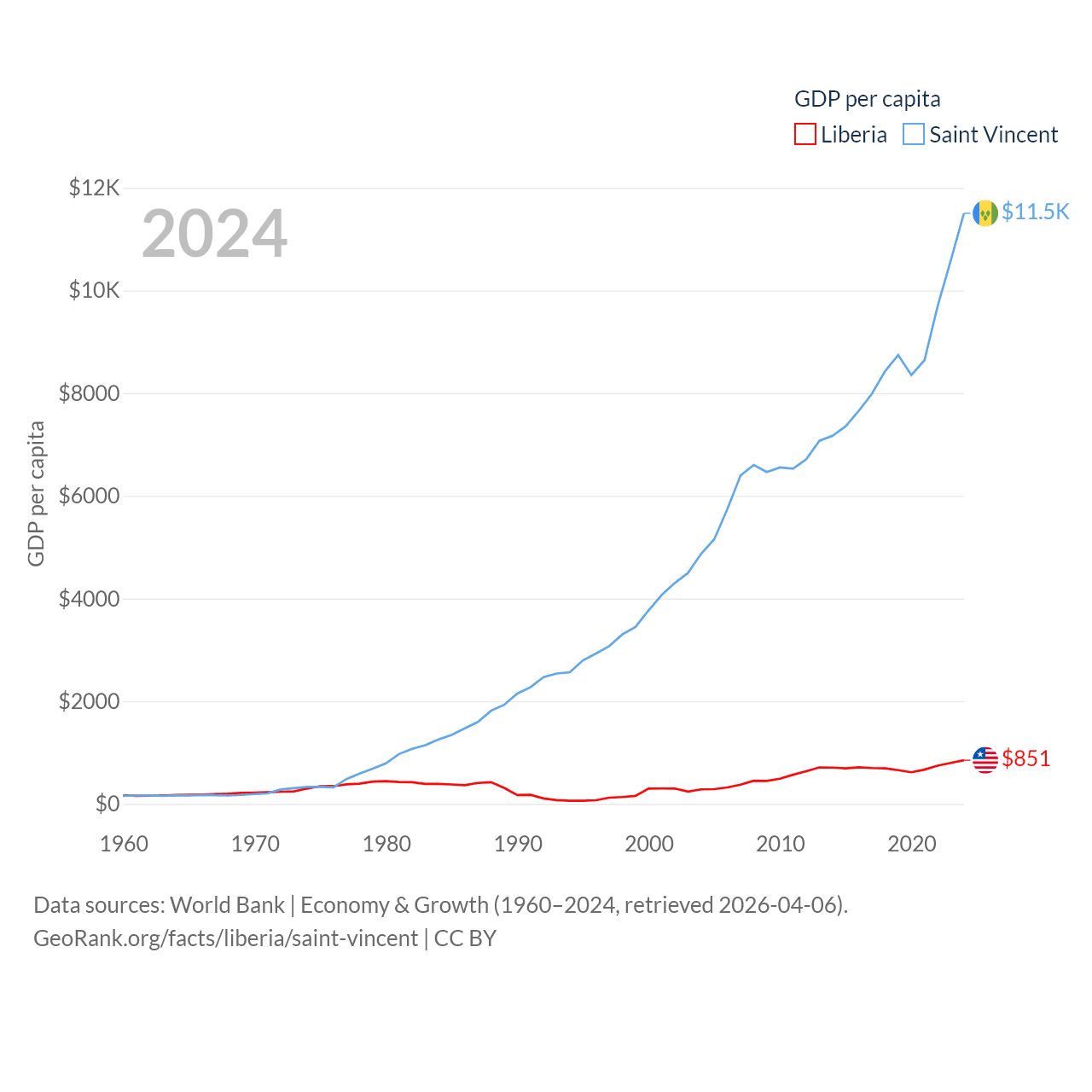 By GDP, Liberia ranks 163/197 ($4.78B) and Saint Vincent ranks 186/197 ($1.16B). By GDP per capita, Liberia ranks 184/197 ($851), while Saint Vincent ranks 81/197 ($11,501).