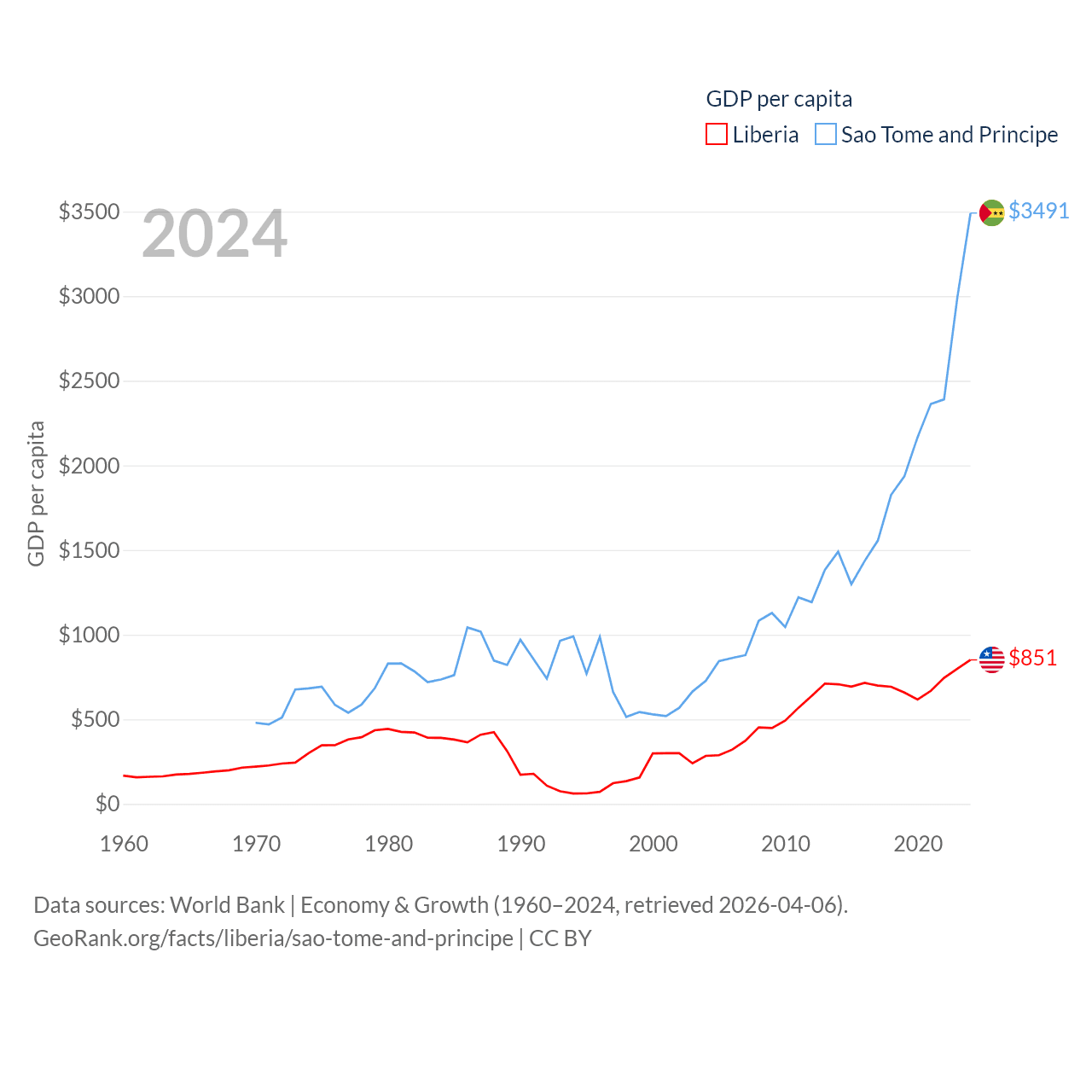 By GDP, Liberia ranks 163/197 ($4.78B) and Sao Tome and Principe ranks 189/197 ($822M). By GDP per capita, Liberia ranks 184/197 ($851), while Sao Tome and Principe ranks 134/197 ($3,491).