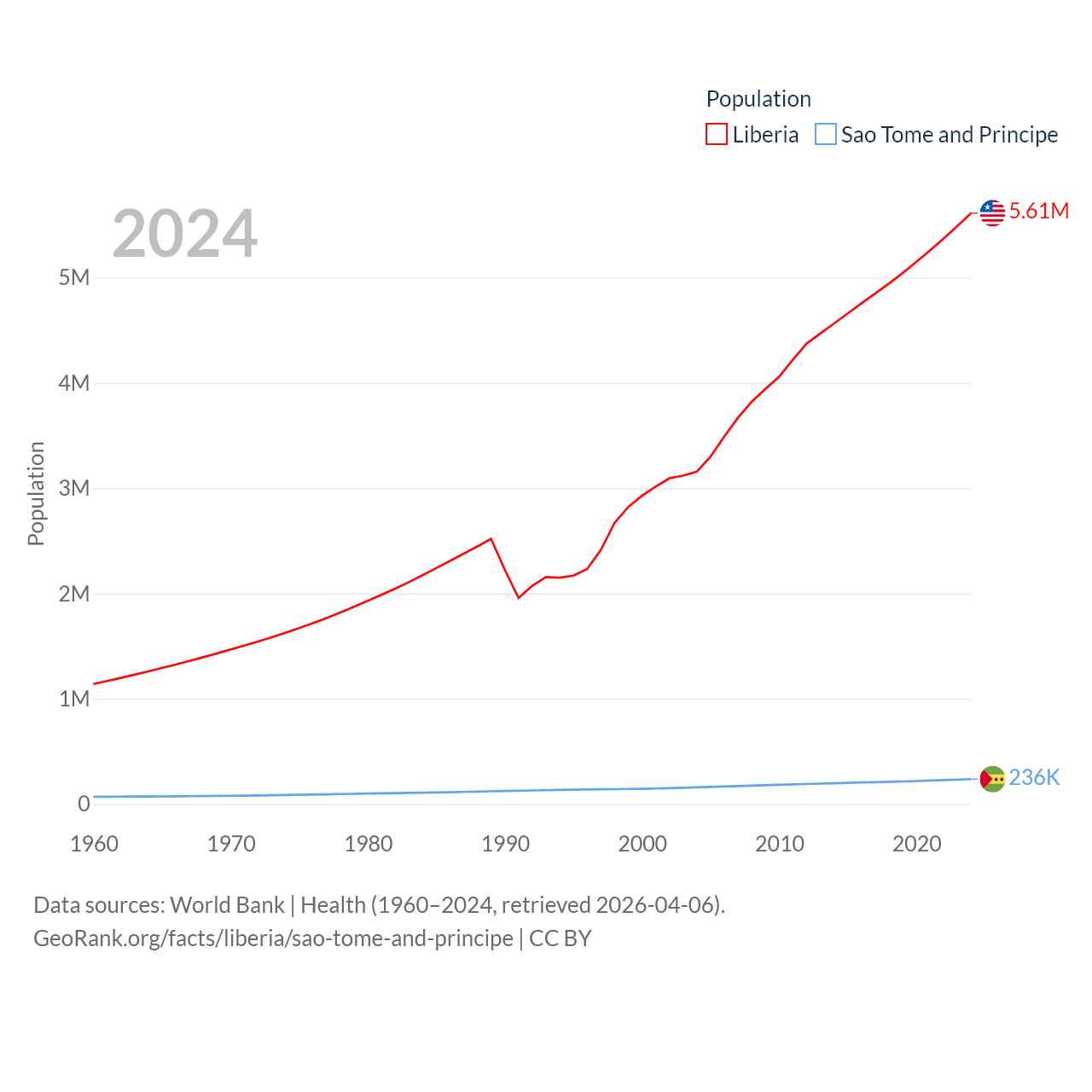 Liberia has a population of 5.61M (ranked 117/197), compared with 236K in Sao Tome and Principe (ranked 176/197). Liberia's land area is 37,189 sq mi versus 371 sq mi for Sao Tome and Principe (ranked 106th vs. 172nd).