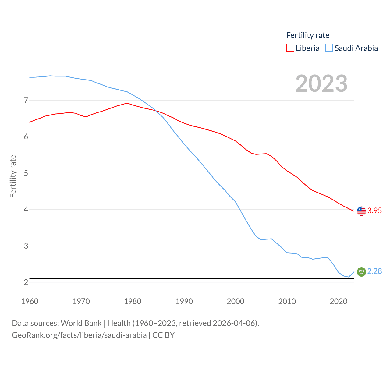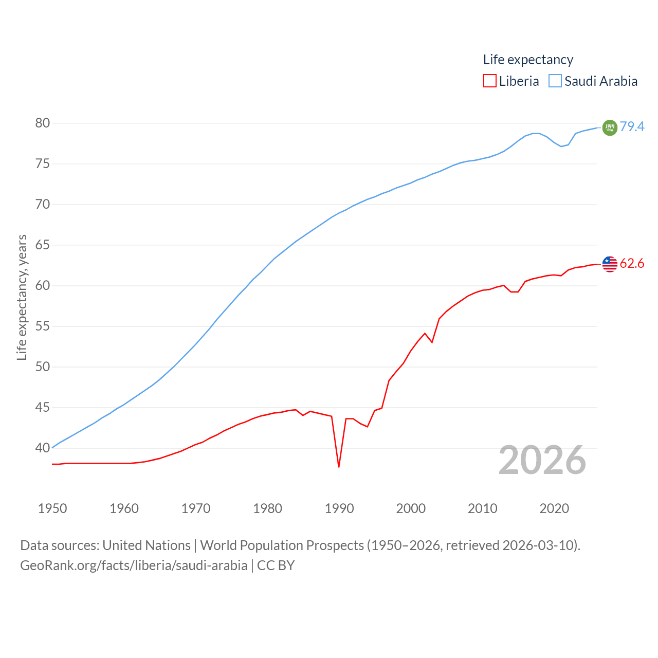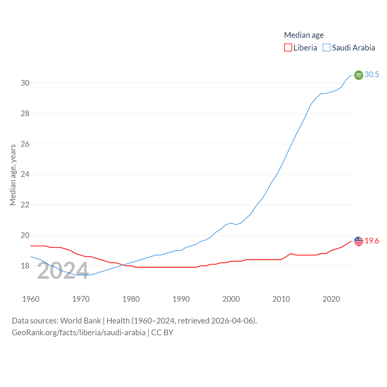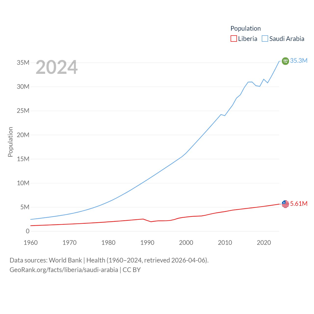 Liberia has a population of 5.61M (ranked 117/197), compared with 35.3M in Saudi Arabia (ranked 45/197). Liberia's land area is 37,189 sq mi versus 830,000 sq mi for Saudi Arabia (ranked 106th vs. 12th).