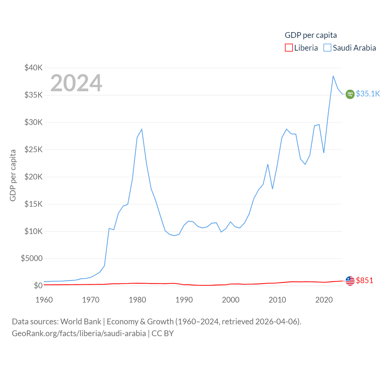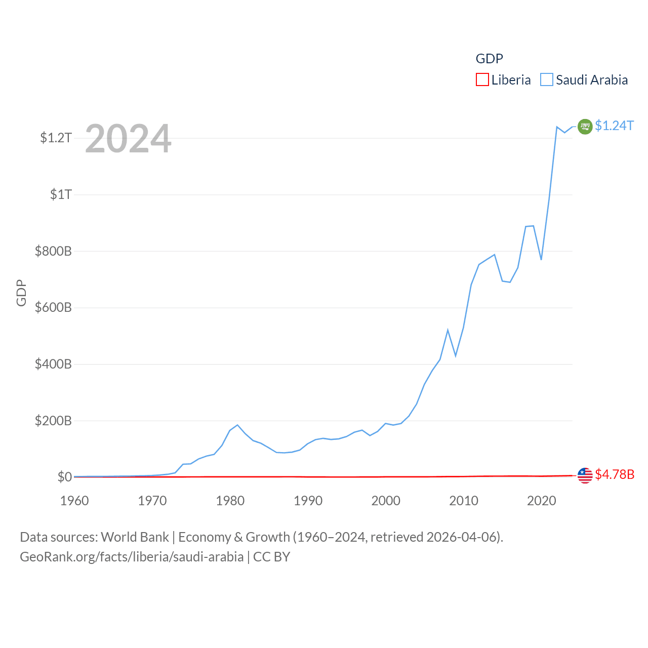 By GDP, Liberia ranks 163/197 ($4.78B) and Saudi Arabia ranks 18/197 ($1.24T). By GDP per capita, Liberia ranks 184/197 ($851), while Saudi Arabia ranks 33/197 ($35,122).
