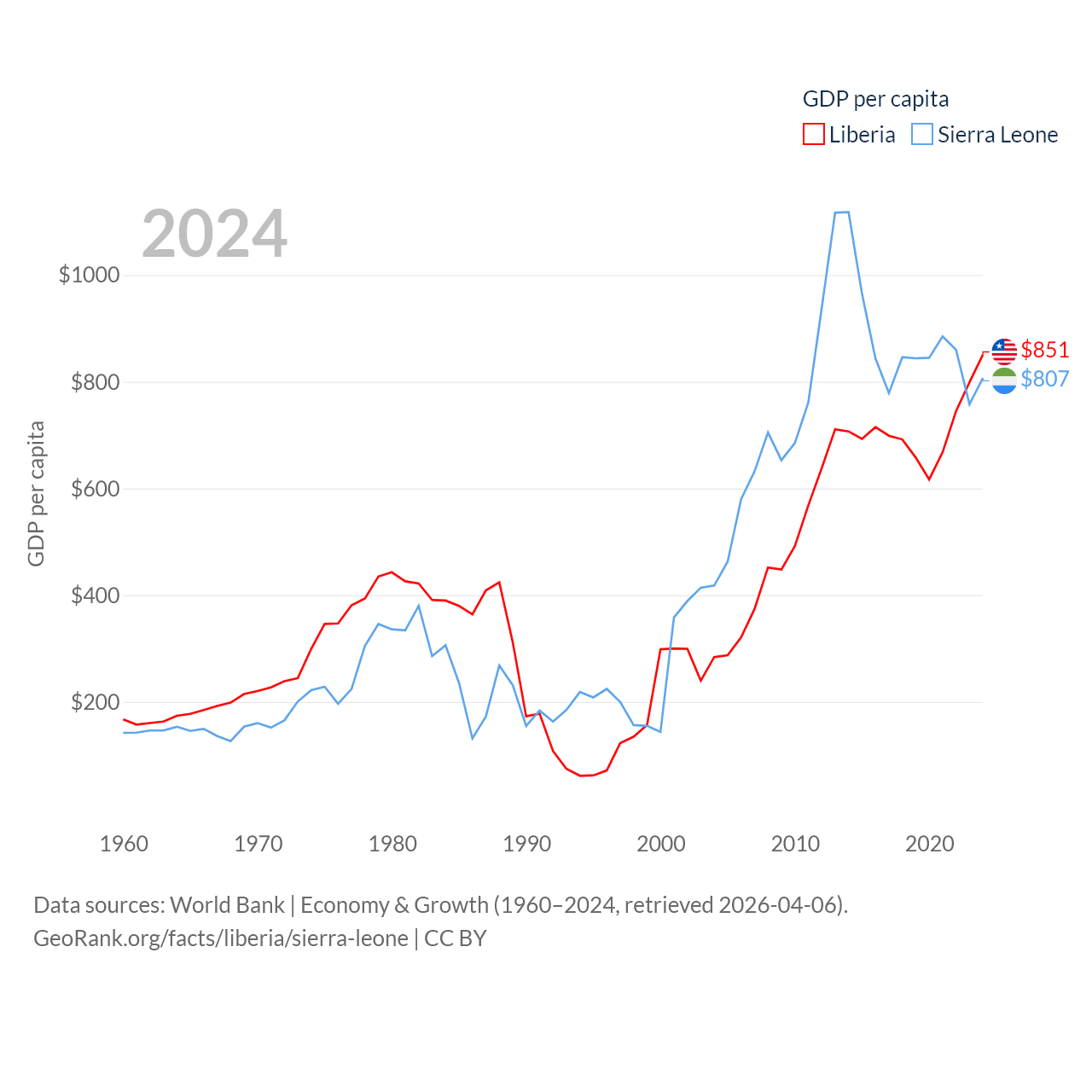 By GDP, Liberia ranks 163/197 ($4.78B) and Sierra Leone ranks 160/197 ($6.97B). By GDP per capita, Liberia ranks 184/197 ($851), while Sierra Leone ranks 186/197 ($807).