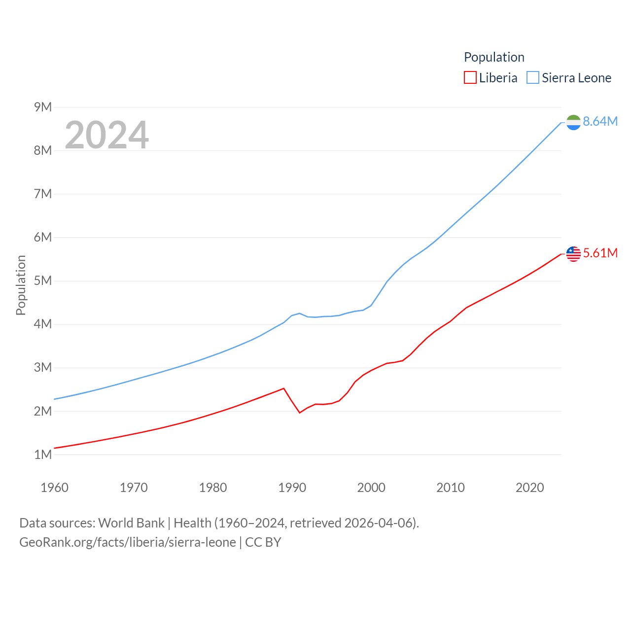 Liberia has a population of 5.61M (ranked 117/197), compared with 8.64M in Sierra Leone (ranked 102/197). Liberia's land area is 37,189 sq mi versus 27,869 sq mi for Sierra Leone (ranked 106th vs. 116th).