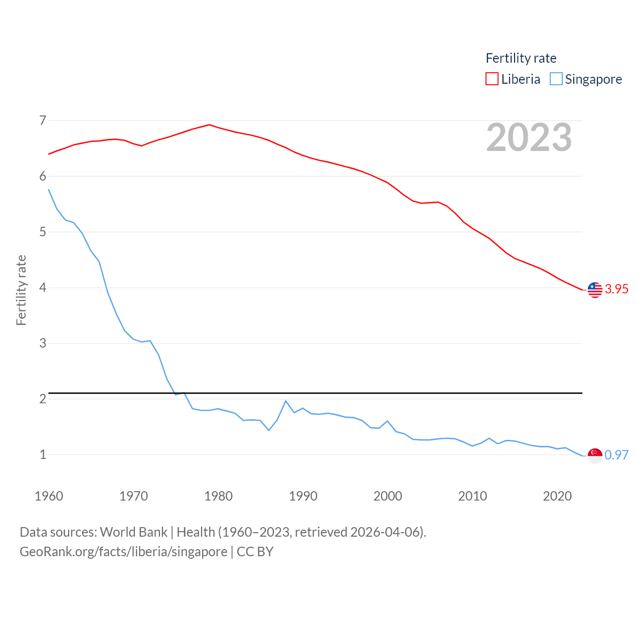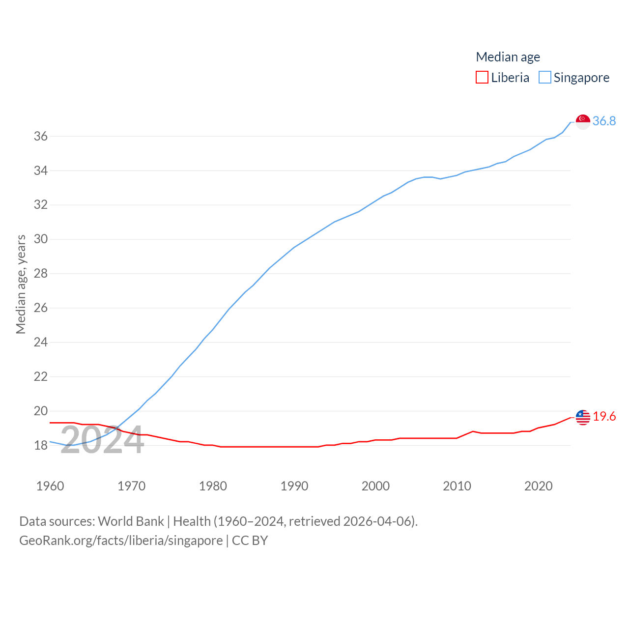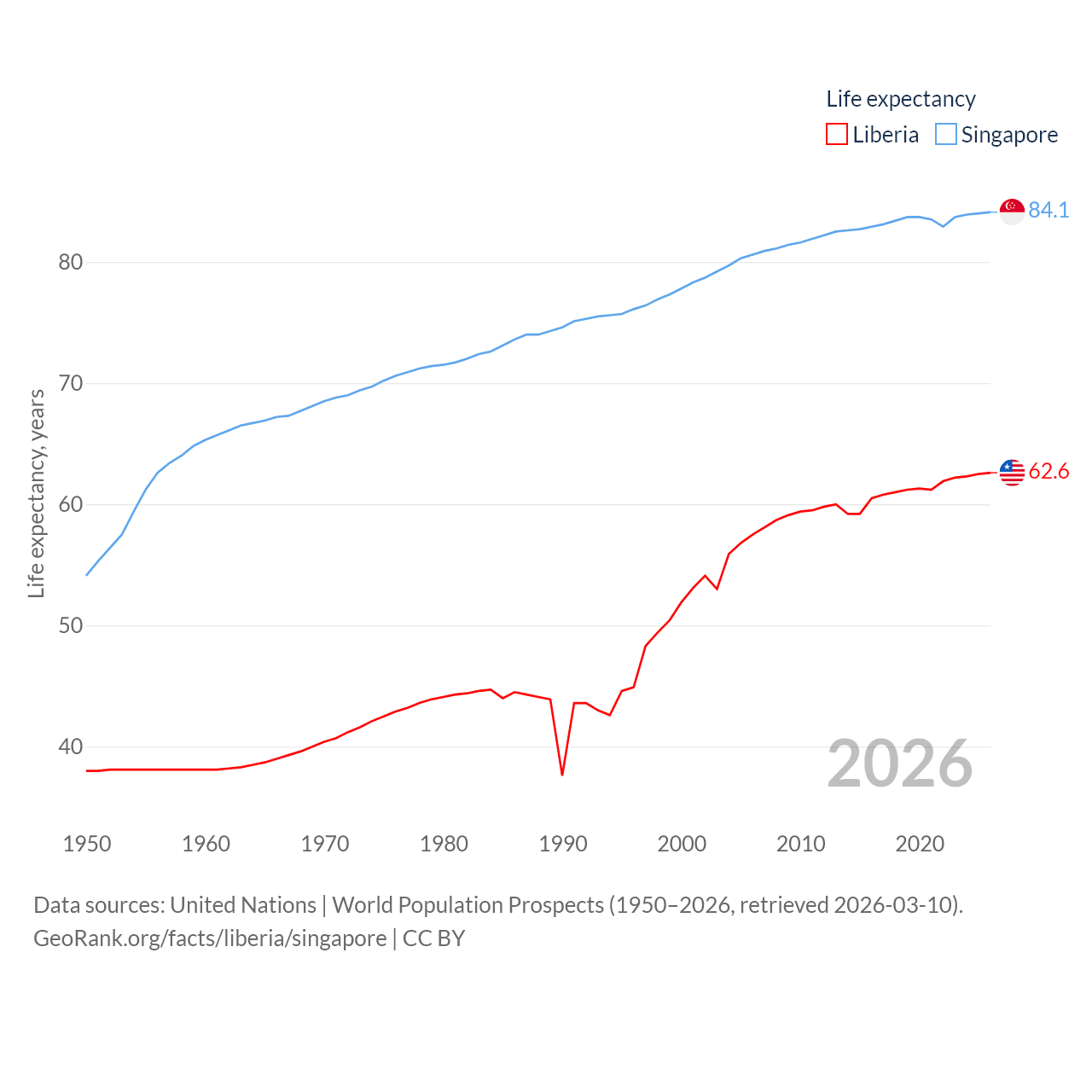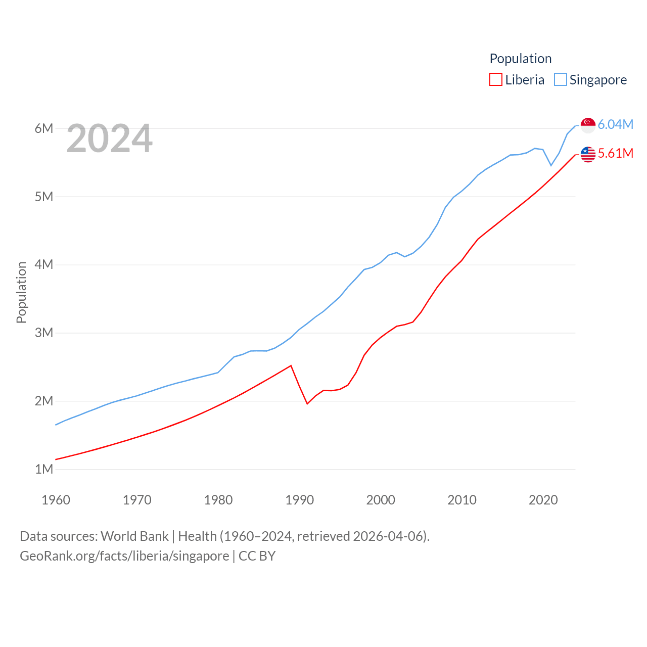 Liberia has a population of 5.61M (ranked 117/197), compared with 6.04M in Singapore (ranked 113/197). Liberia's land area is 37,189 sq mi versus 277.2 sq mi for Singapore (ranked 106th vs. 177th).