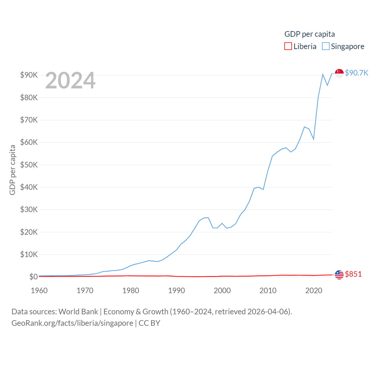 By GDP, Liberia ranks 163/197 ($4.78B) and Singapore ranks 28/197 ($547B). By GDP per capita, Liberia ranks 184/197 ($851), while Singapore ranks 7/197 ($90,674).