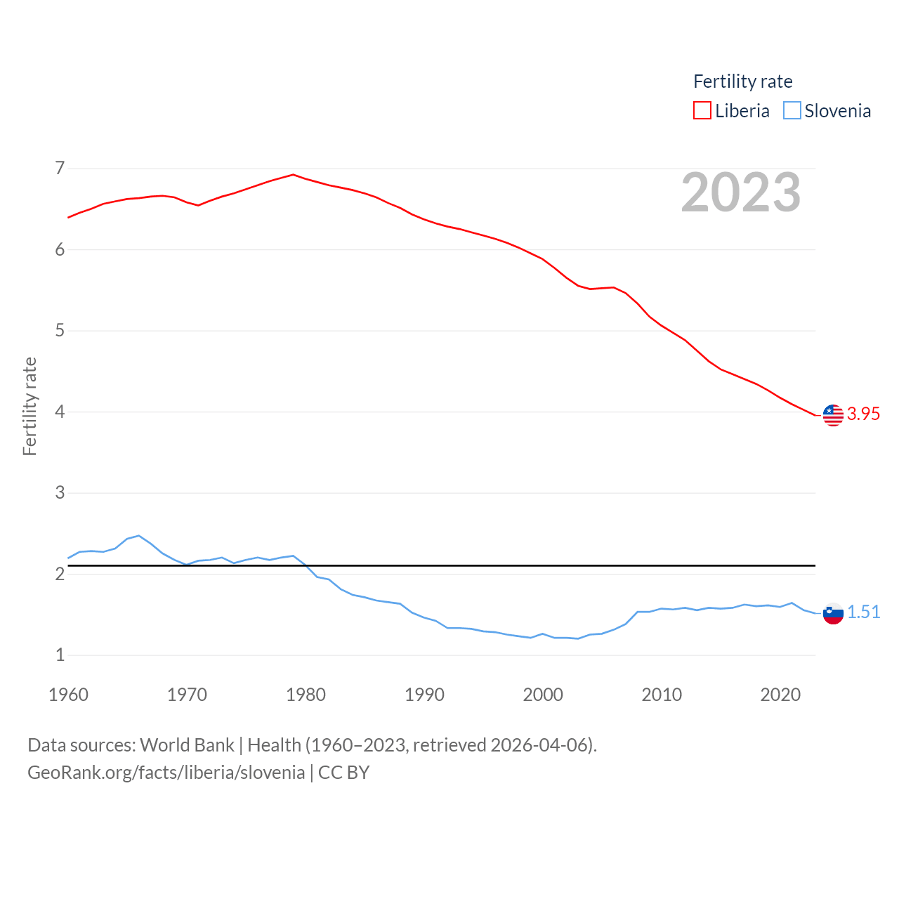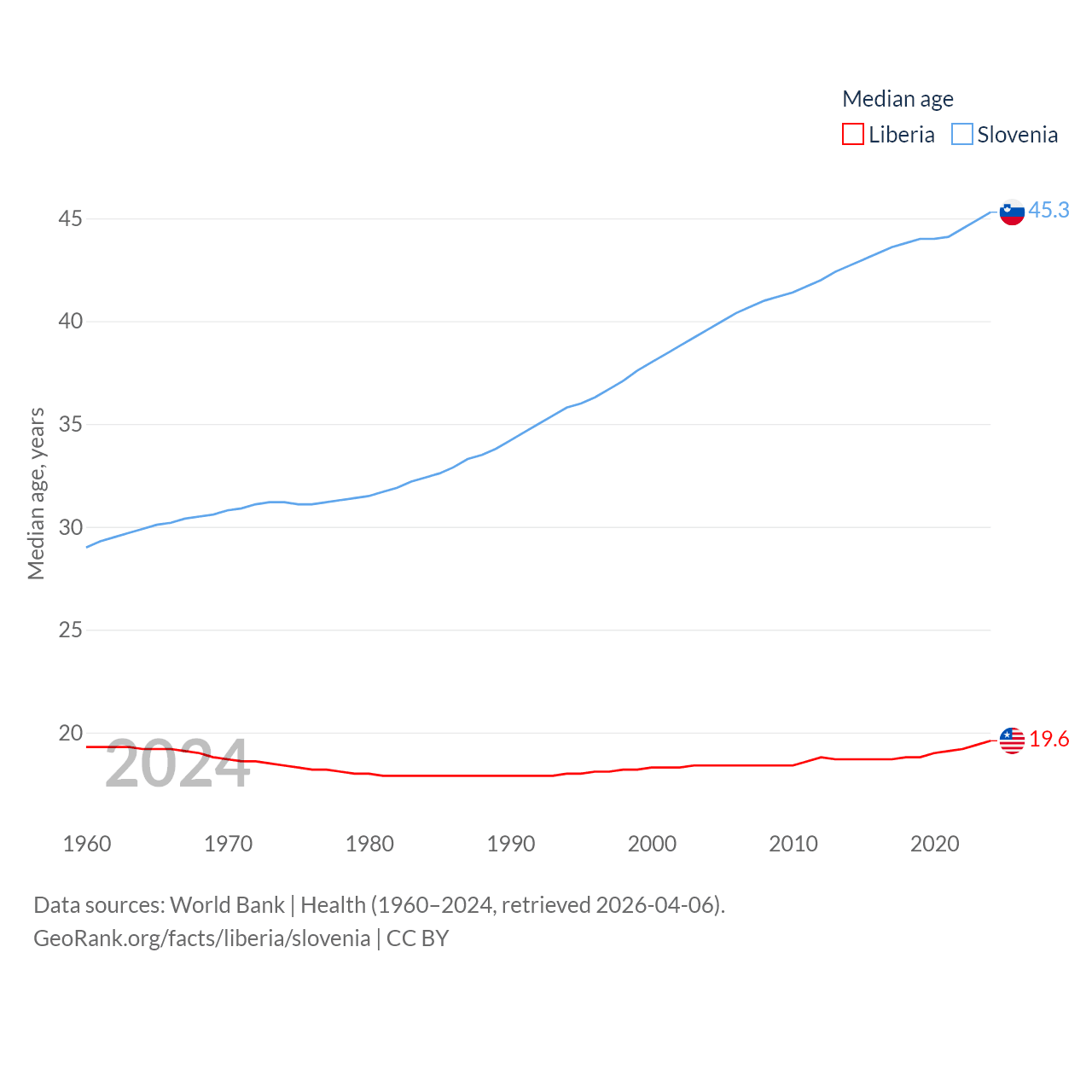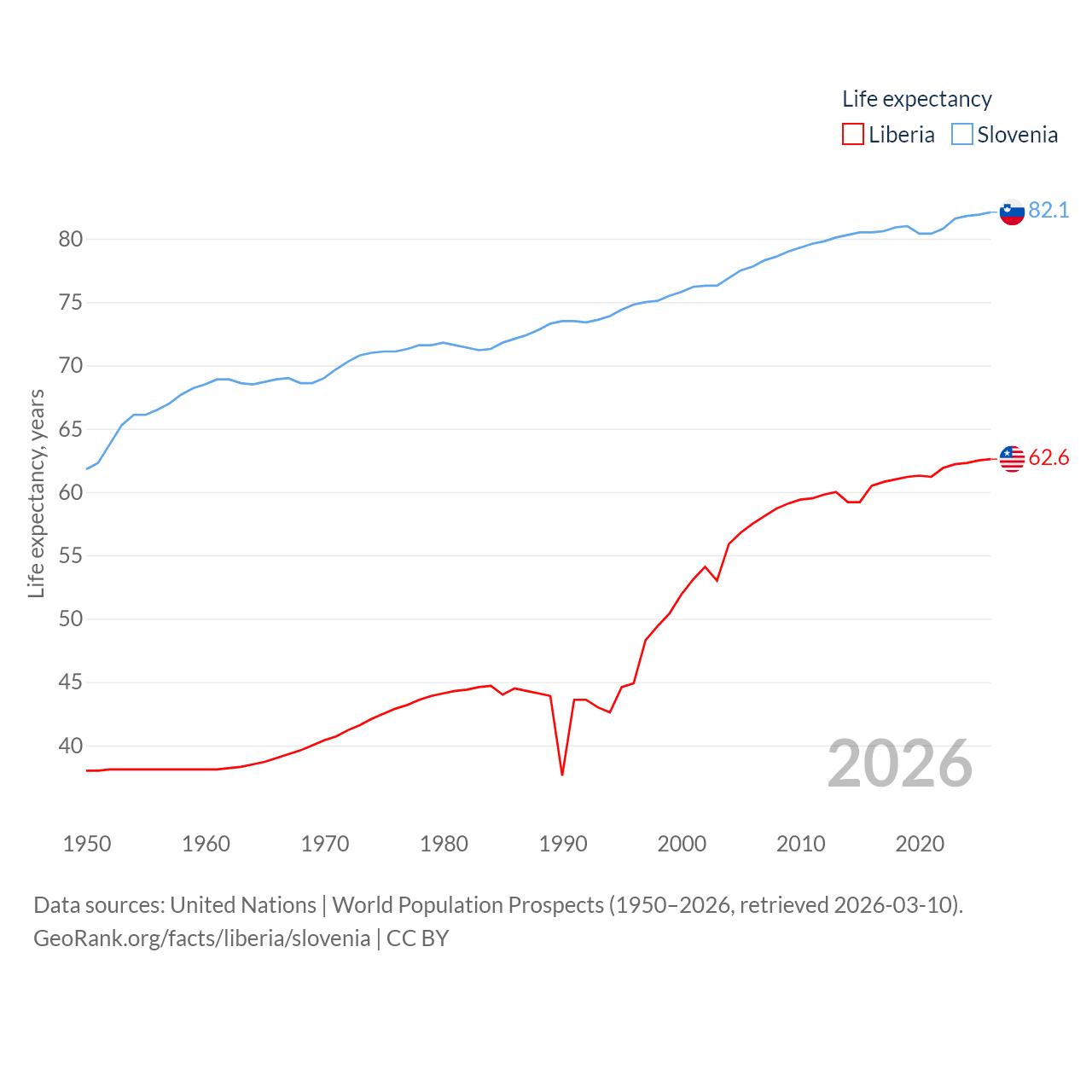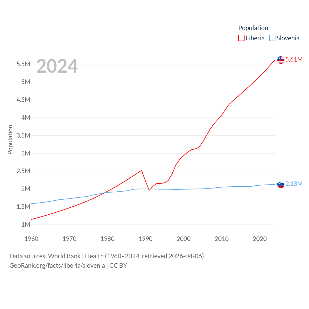 Liberia has a population of 5.61M (ranked 117/197), compared with 2.13M in Slovenia (ranked 147/197). Liberia's land area is 37,189 sq mi versus 7,774 sq mi for Slovenia (ranked 106th vs. 151st).