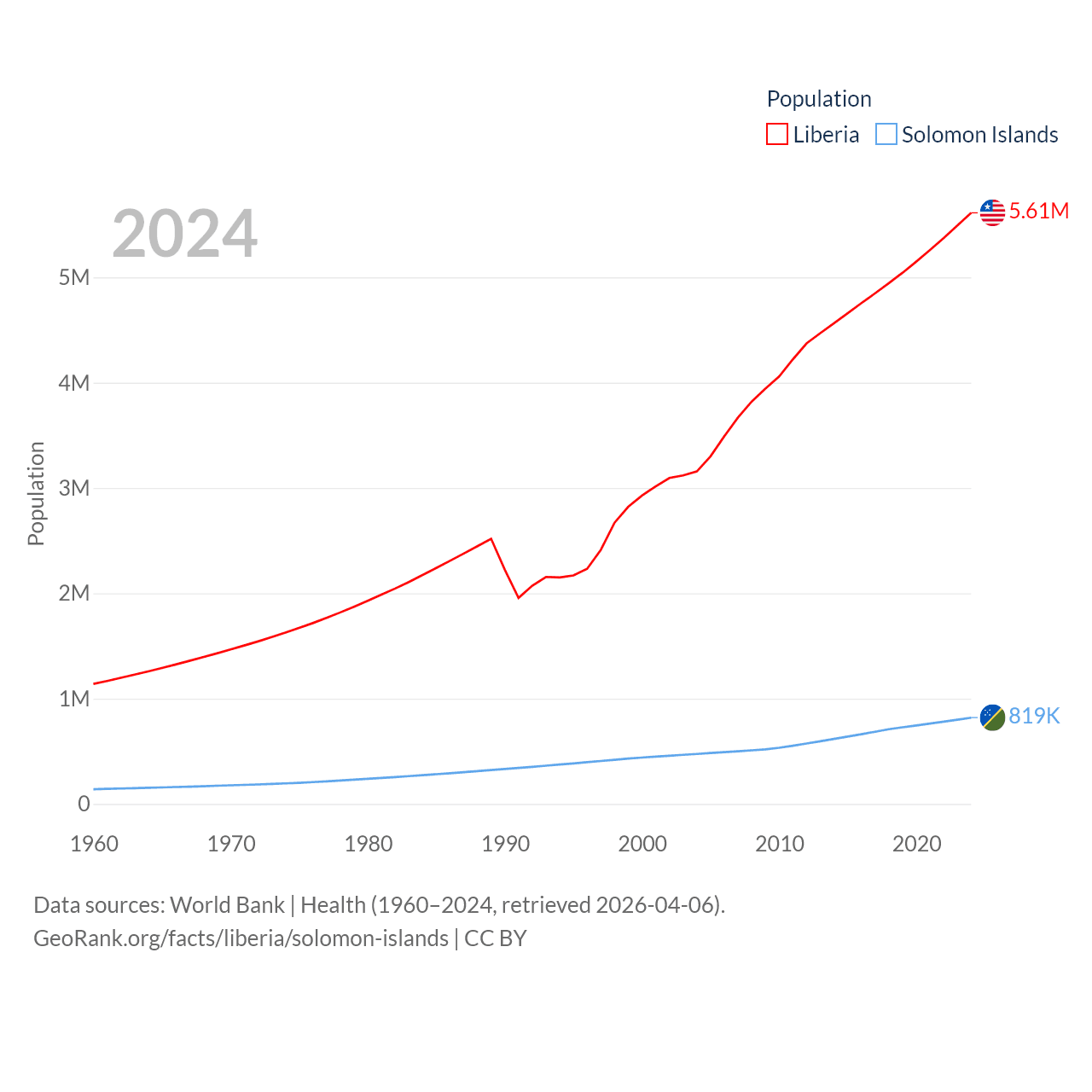 Liberia has a population of 5.61M (ranked 117/197), compared with 819K in The Solomon Islands (ranked 162/197). Liberia's land area is 37,189 sq mi versus 10,807 sq mi for The Solomon Islands (ranked 106th vs. 141st).