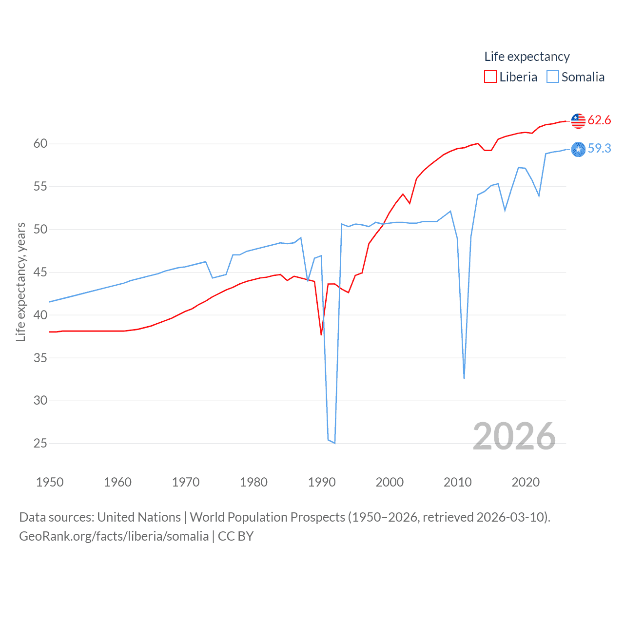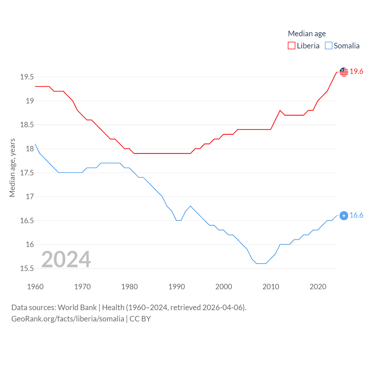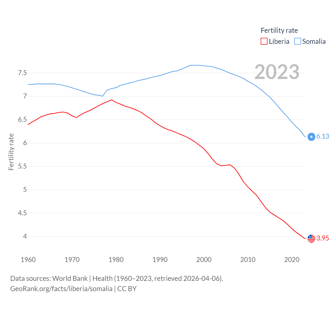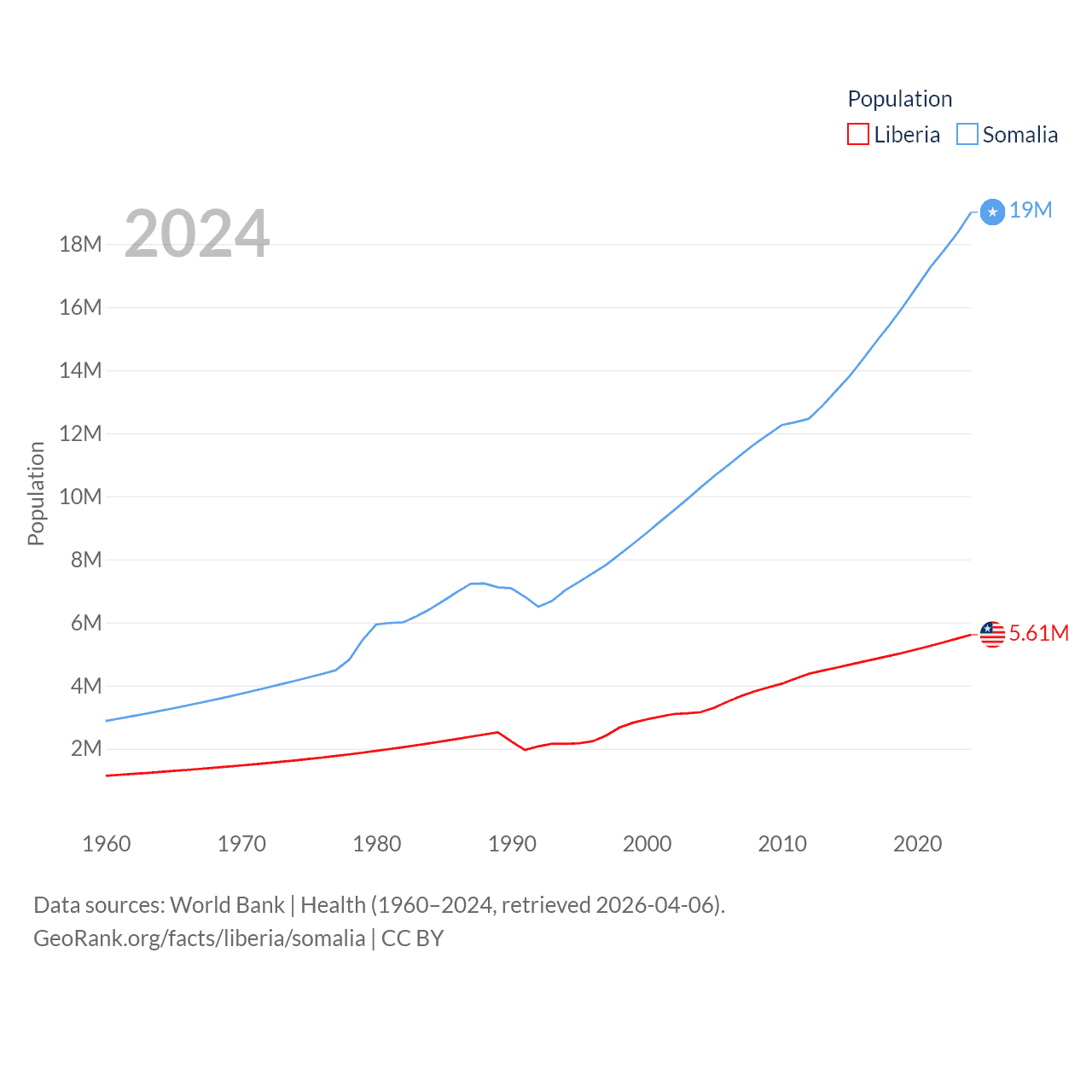 Liberia has a population of 5.61M (ranked 117/197), compared with 19M in Somalia (ranked 68/197). Liberia's land area is 37,189 sq mi versus 242,217 sq mi for Somalia (ranked 106th vs. 42nd).