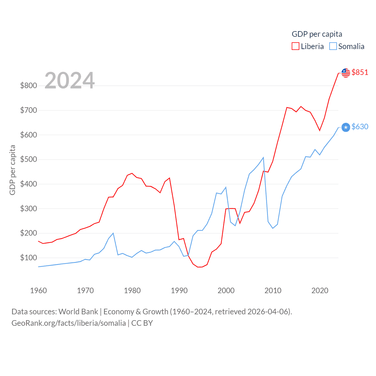 By GDP, Liberia ranks 163/197 ($4.78B) and Somalia ranks 150/197 ($12B). By GDP per capita, Liberia ranks 184/197 ($851), while Somalia ranks 192/197 ($630).