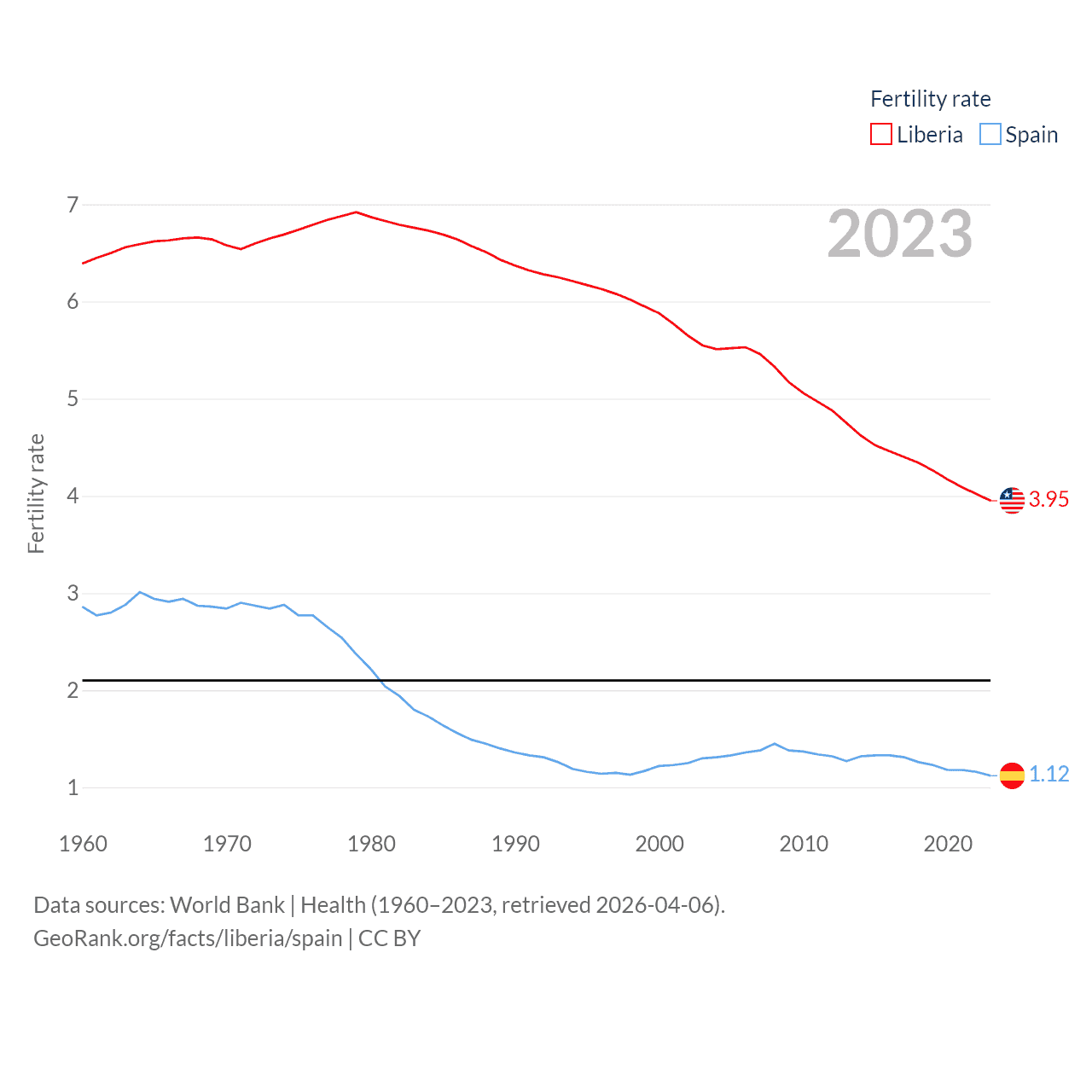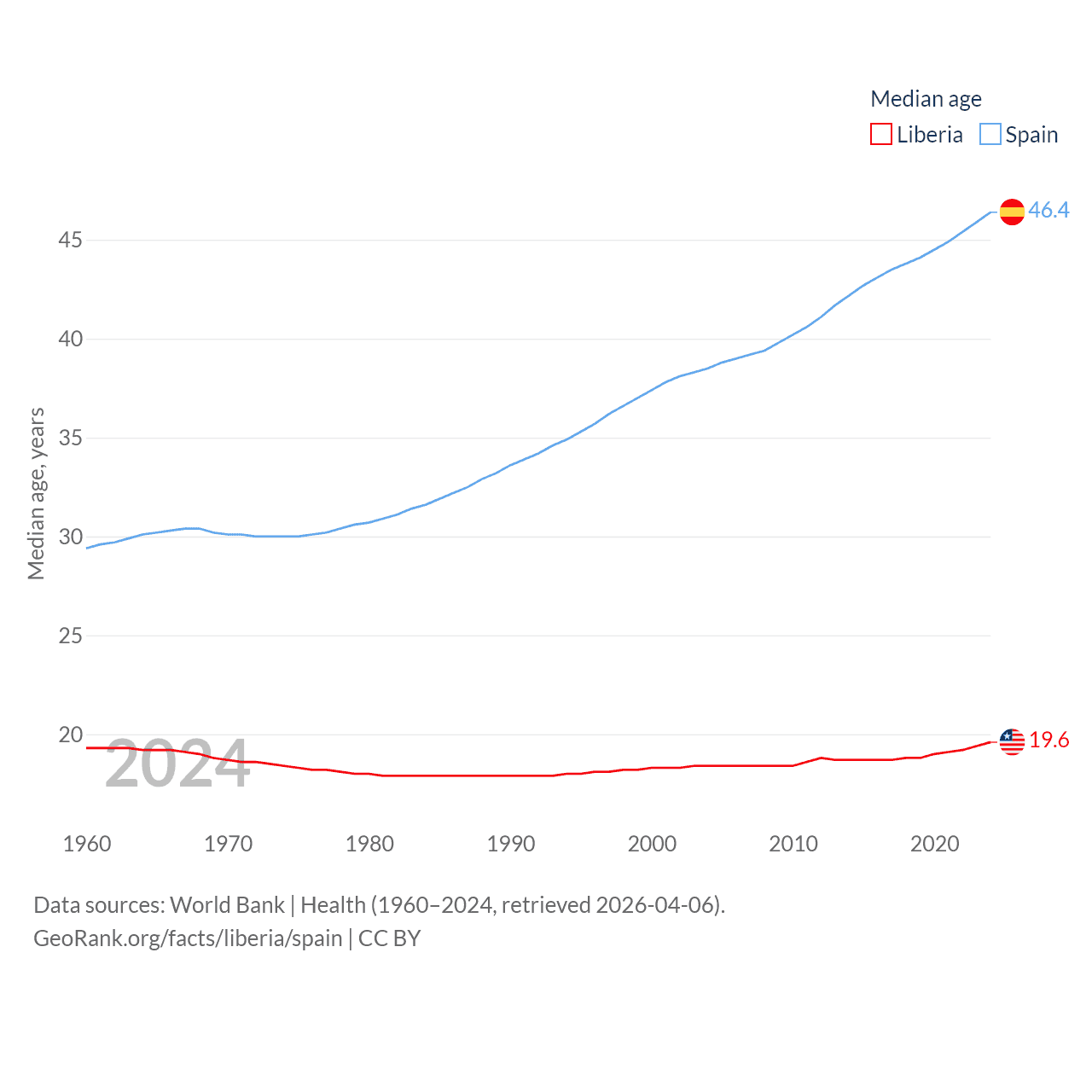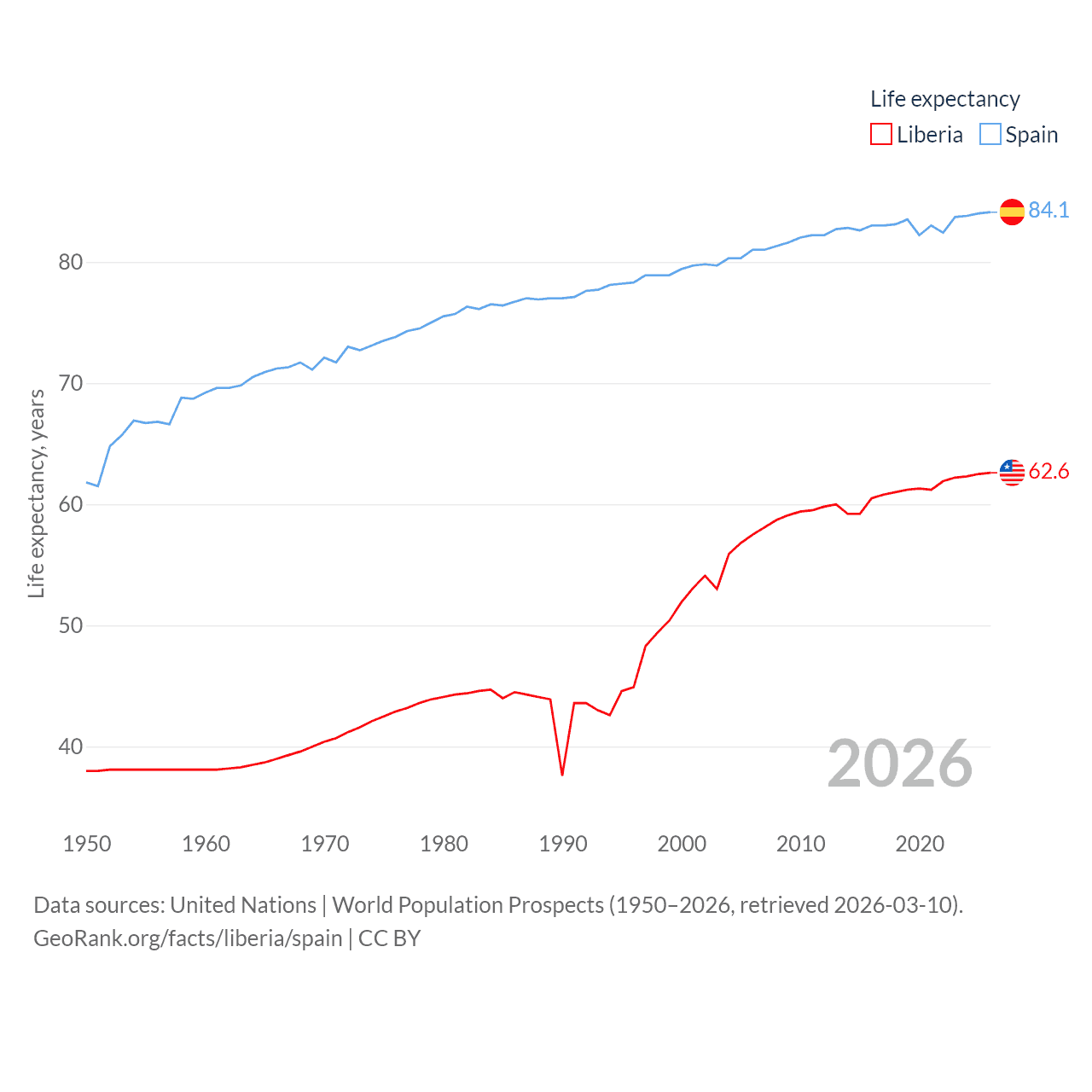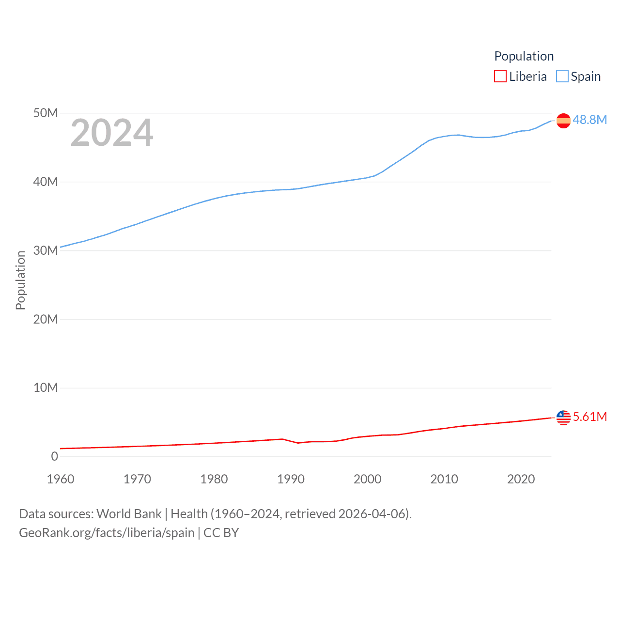 Liberia has a population of 5.61M (ranked 117/197), compared with 48.8M in Spain (ranked 32/197). Liberia's land area is 37,189 sq mi versus 192,934 sq mi for Spain (ranked 106th vs. 51st).