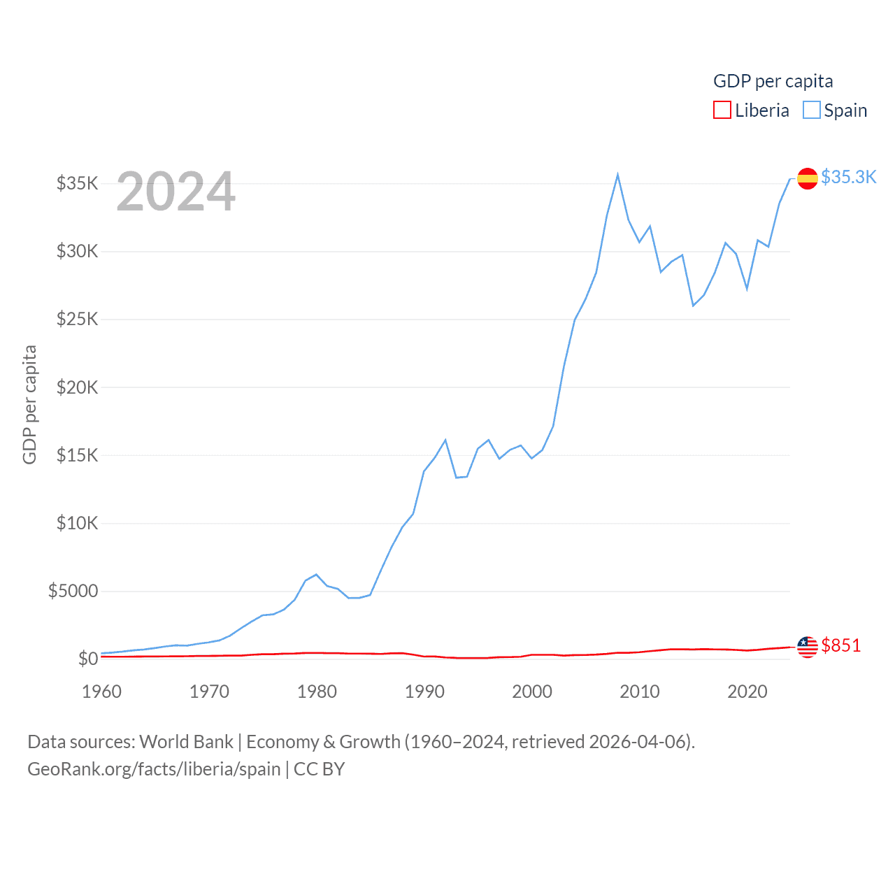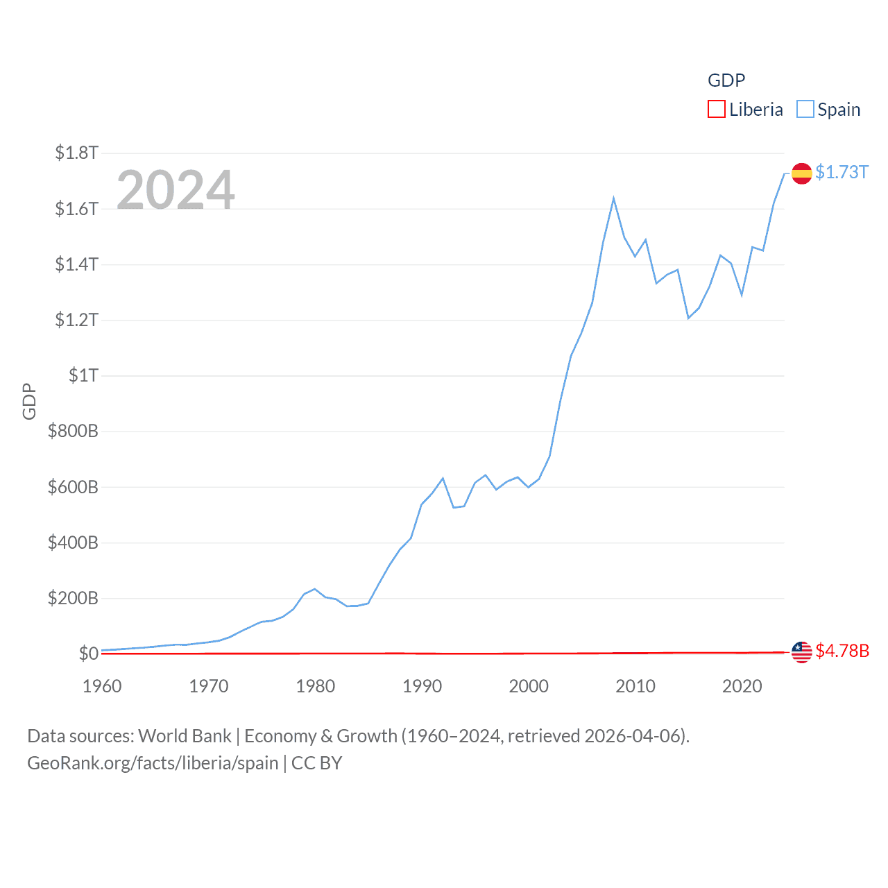 By GDP, Liberia ranks 163/197 ($4.78B) and Spain ranks 15/197 ($1.73T). By GDP per capita, Liberia ranks 184/197 ($851), while Spain ranks 32/197 ($35,327).
