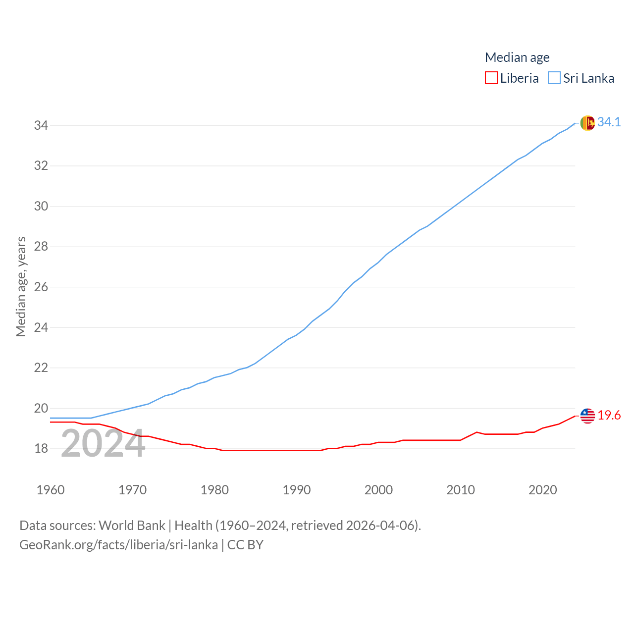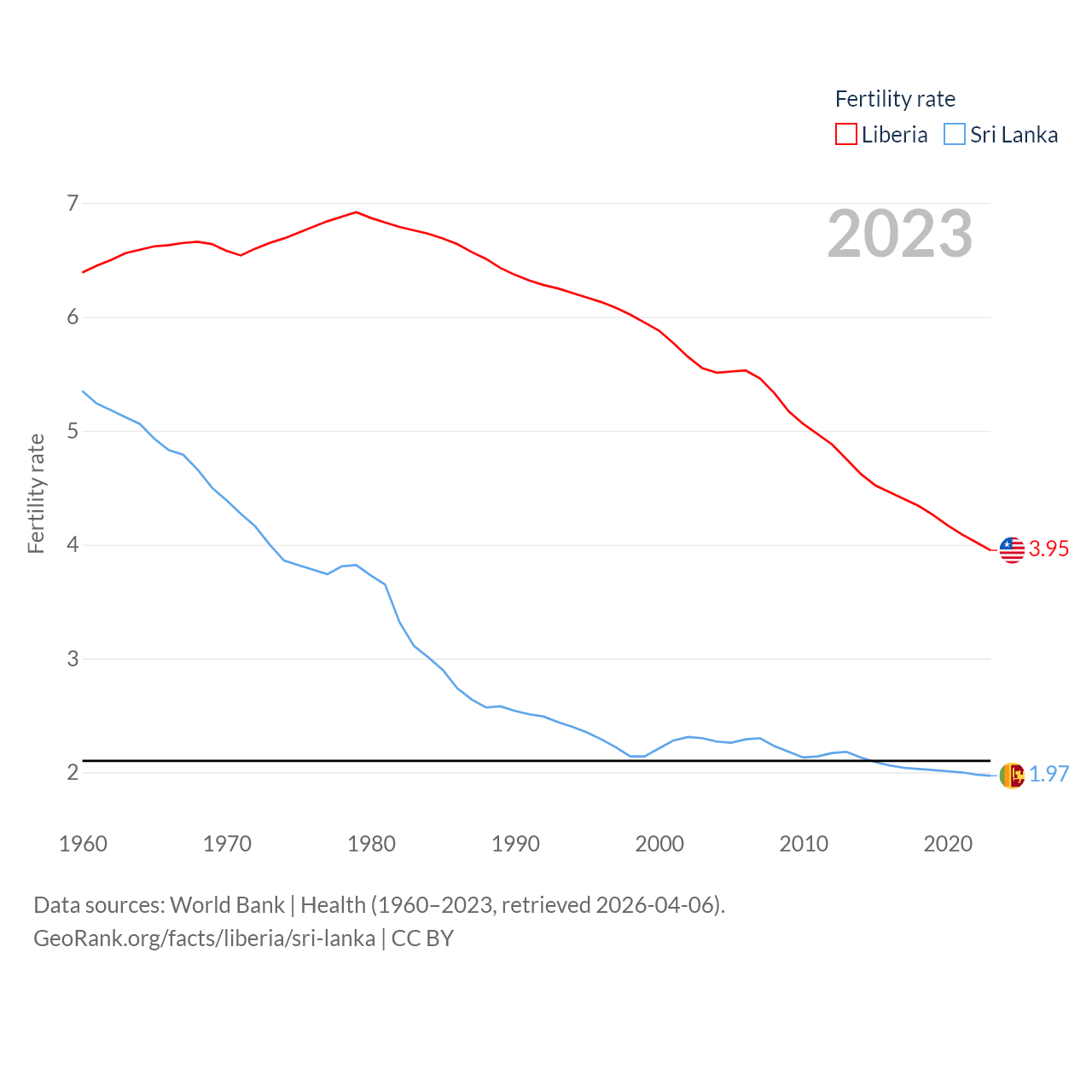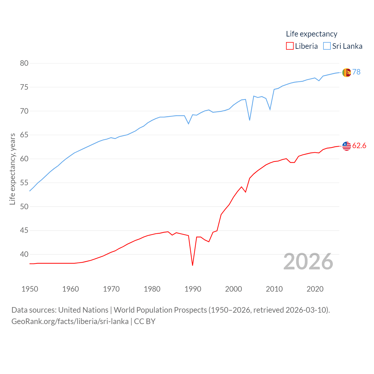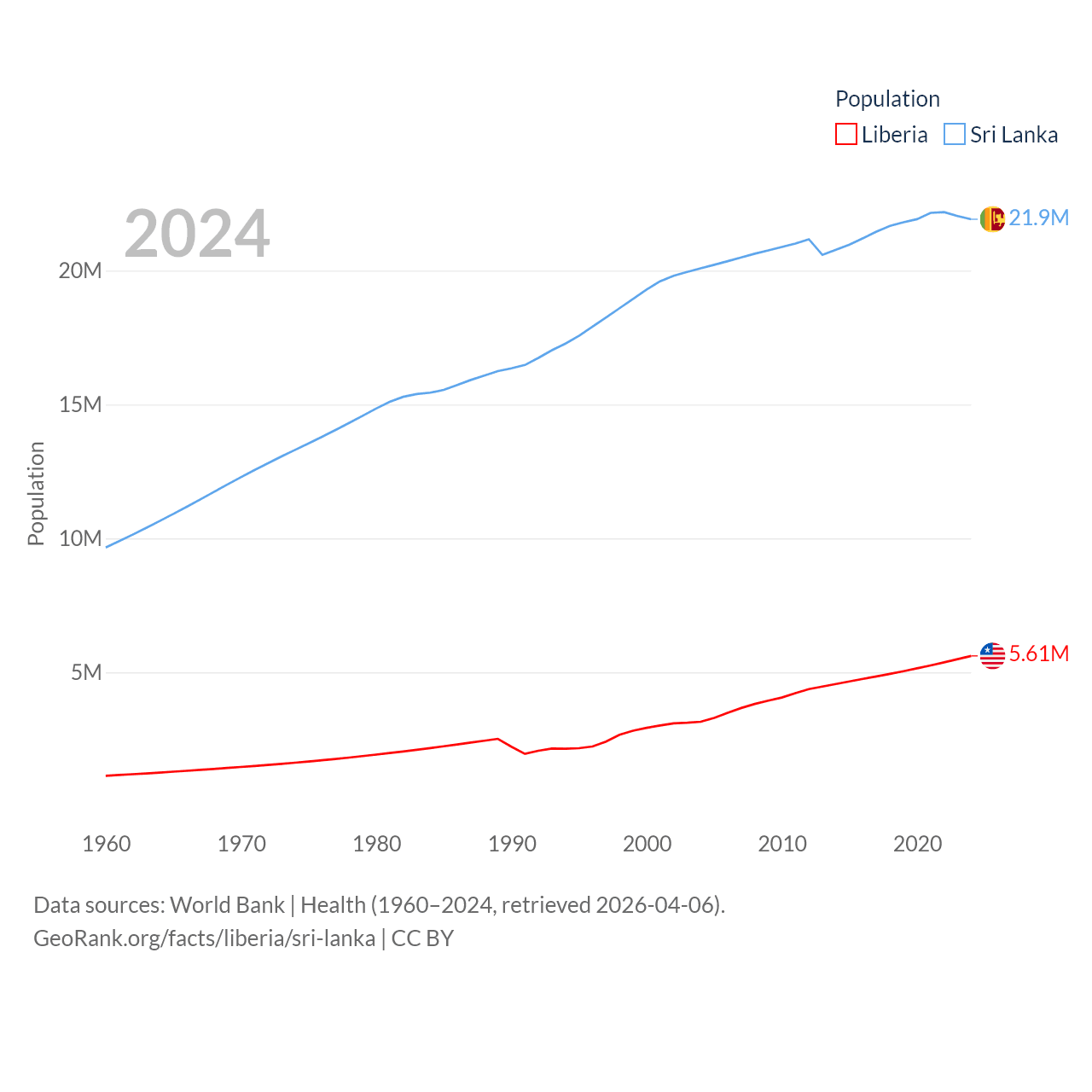 Liberia has a population of 5.61M (ranked 117/197), compared with 21.9M in Sri Lanka (ranked 61/197). Liberia's land area is 37,189 sq mi versus 23,884 sq mi for Sri Lanka (ranked 106th vs. 122nd).