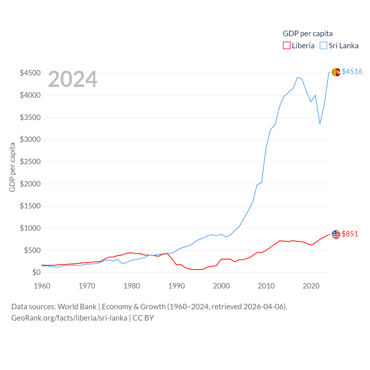 By GDP, Liberia ranks 163/197 ($4.78B) and Sri Lanka ranks 72/197 ($99B). By GDP per capita, Liberia ranks 184/197 ($851), while Sri Lanka ranks 124/197 ($4,516).