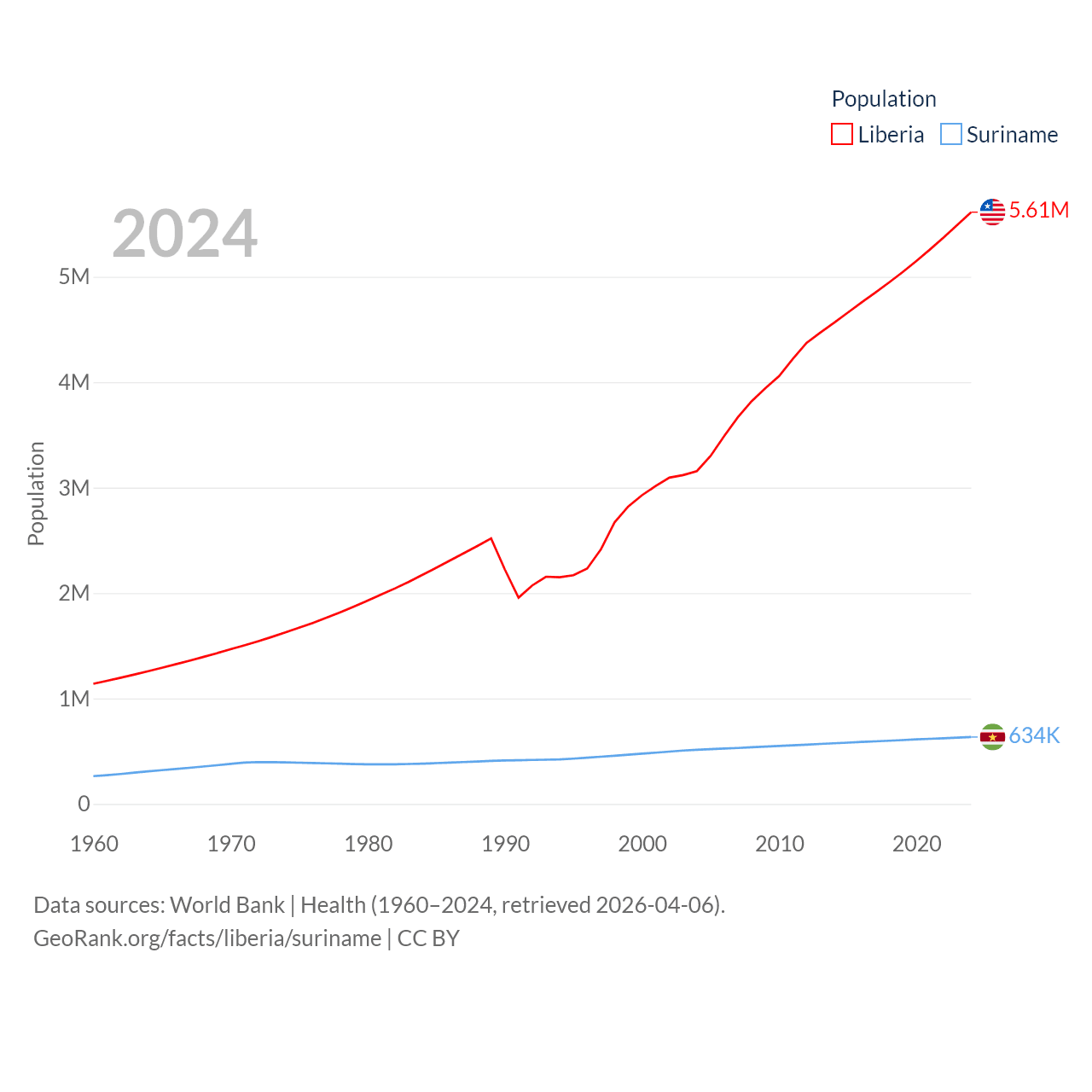 Liberia has a population of 5.61M (ranked 117/197), compared with 634K in Suriname (ranked 165/197). Liberia's land area is 37,189 sq mi versus 61,972 sq mi for Suriname (ranked 106th vs. 90th).