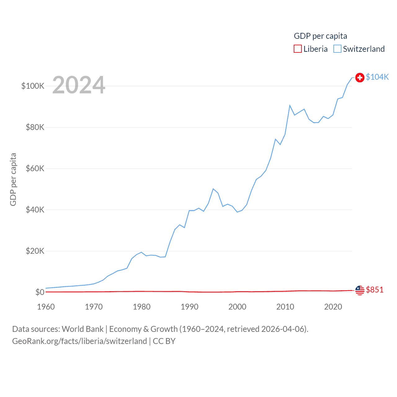 By GDP, Liberia ranks 163/197 ($4.78B) and Switzerland ranks 20/197 ($937B). By GDP per capita, Liberia ranks 184/197 ($851), while Switzerland ranks 5/197 ($103,998).
