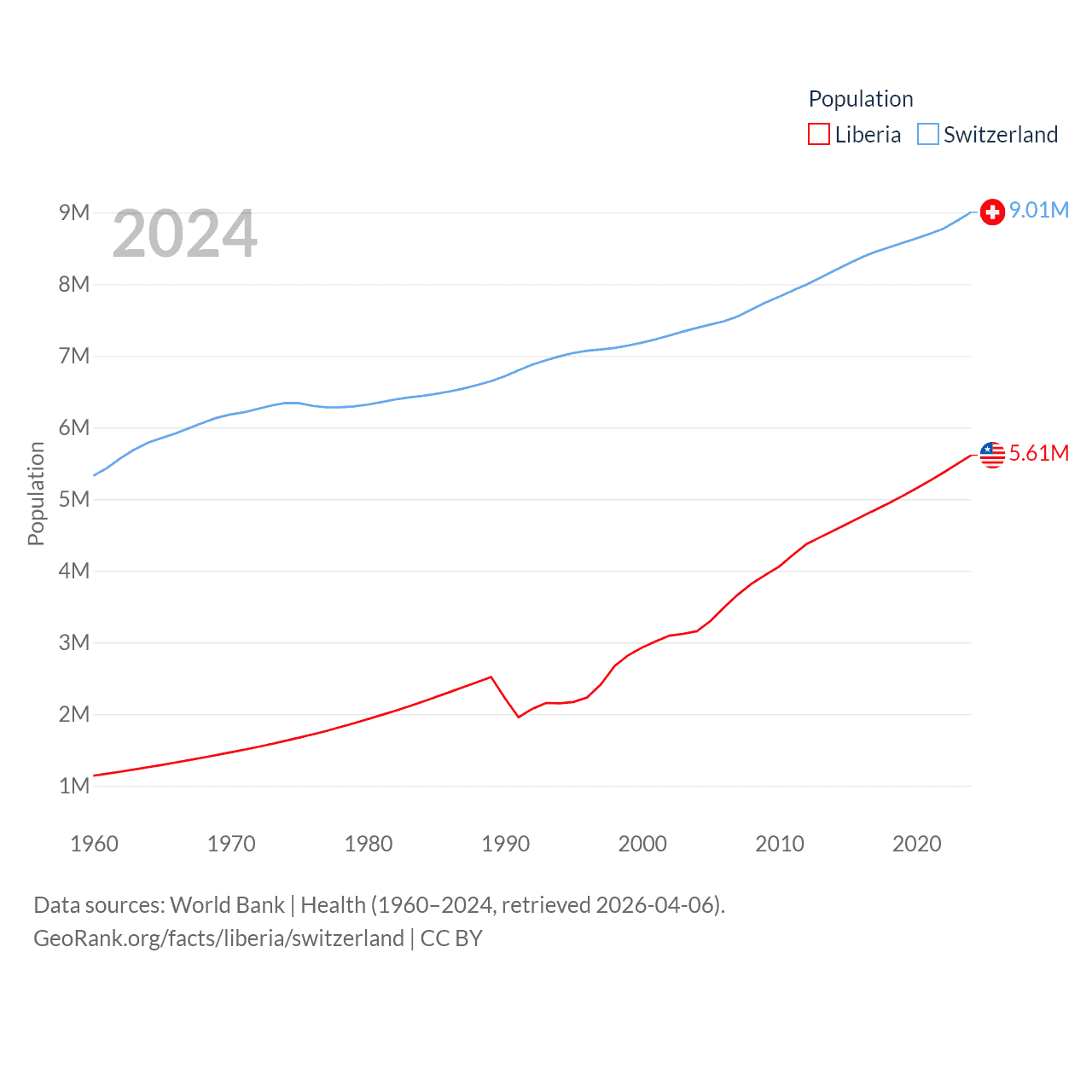Liberia has a population of 5.61M (ranked 117/197), compared with 9.01M in Switzerland (ranked 101/197). Liberia's land area is 37,189 sq mi versus 15,255 sq mi for Switzerland (ranked 106th vs. 131st).